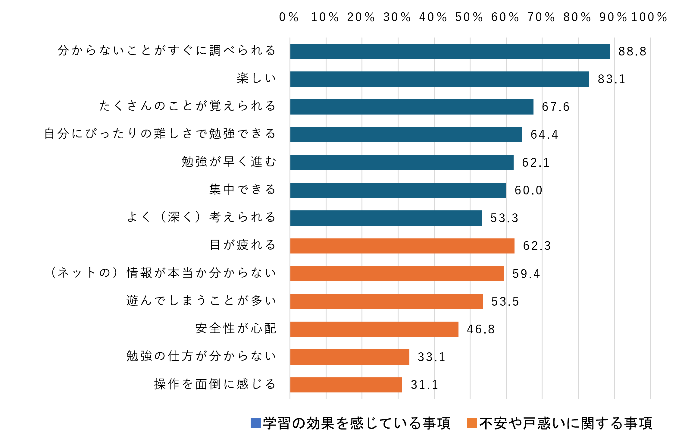 以上より、学年が上がるにつれて情報機器の利用に慣れ、活用の幅も広がることで、学習内容の理解や深化をより強く実感する一方で、情報の信頼性や安全性などに対する不安や戸惑いを感じる児童・生徒も増えていることが示唆されます。