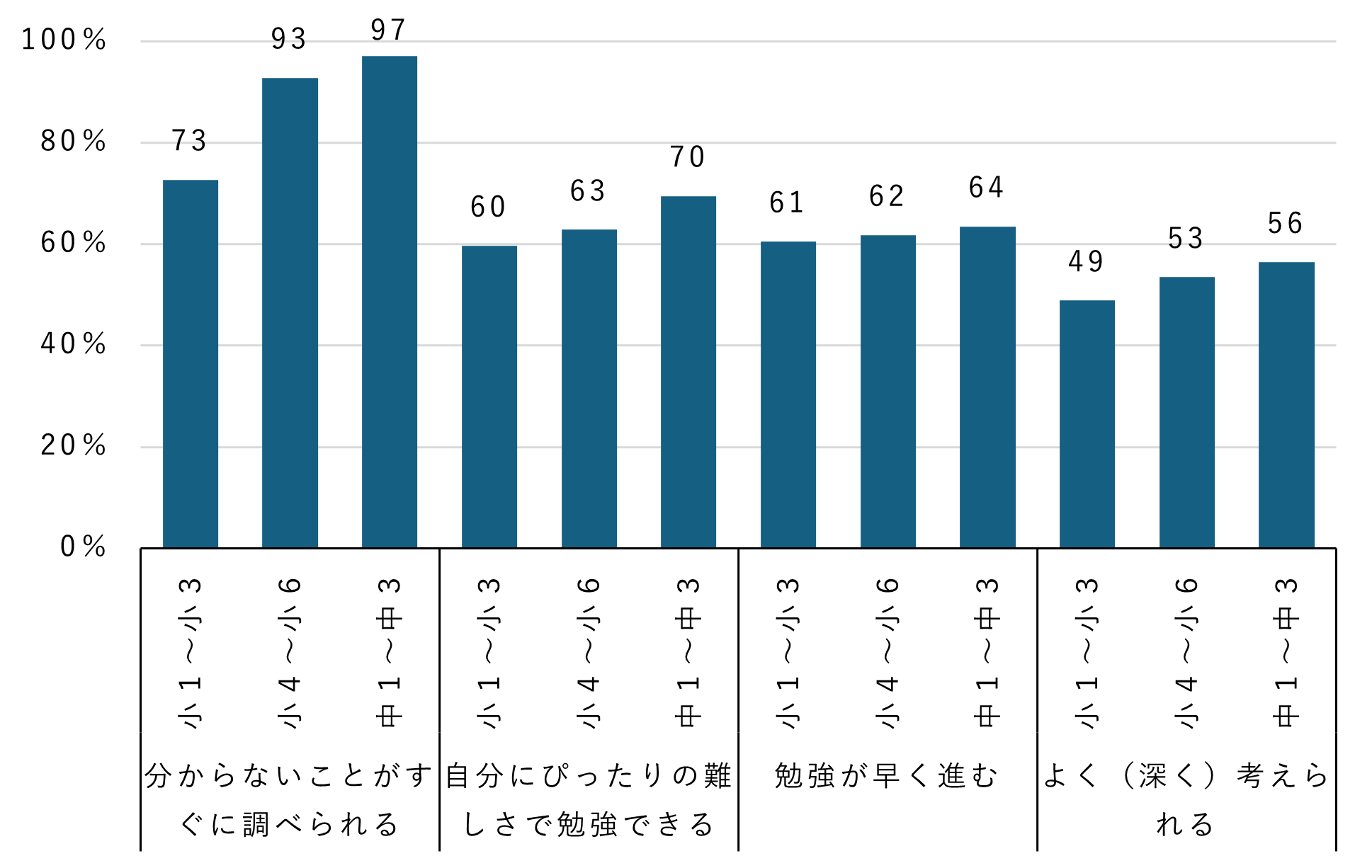 1. 「分からないことがすぐに調べられる」や「楽しい」と感じている児童・生徒は8割を超える