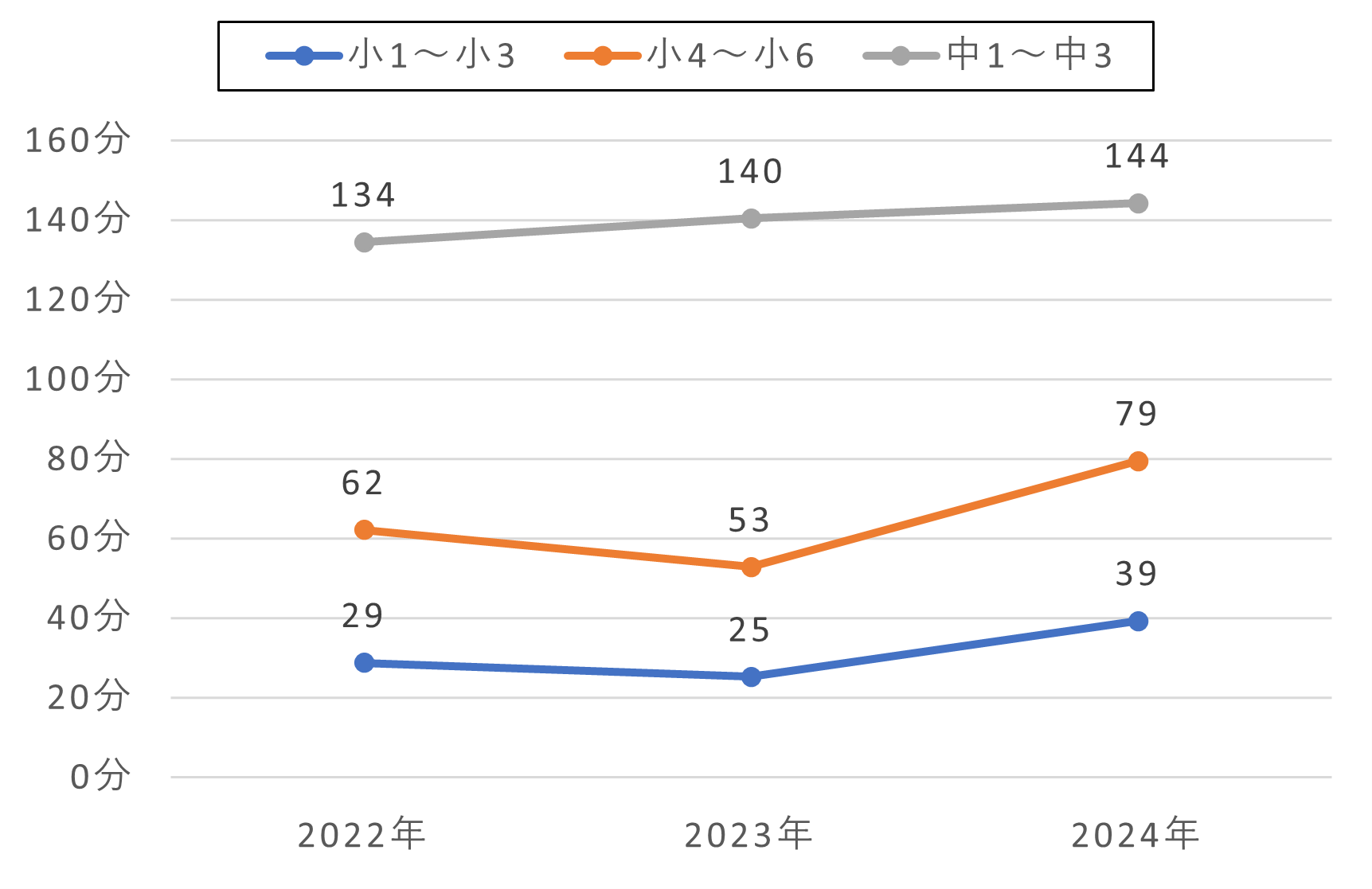 次に、比較可能な関東地域の小中学生を対象に、2022年から2024年にかけてのスマホの利用時間(勉強目的・勉強以外を含む)を比較しました。