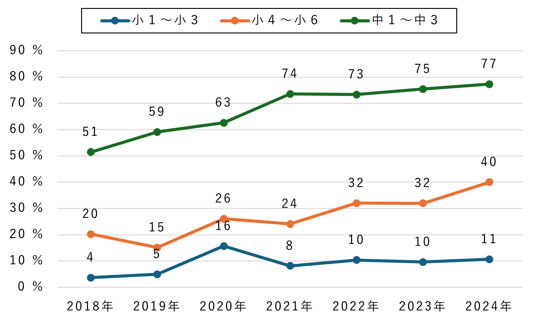 小中学生のスマホ所有率は年々上昇し(2025年1月30日レポート参照)、所有開始時期も早まっています(2025年3月17日レポート参照)。さらに、GIGAスクール構想の進展により、学校での情報機器の利用も広がっています(2025年5月8日レポート参照)。