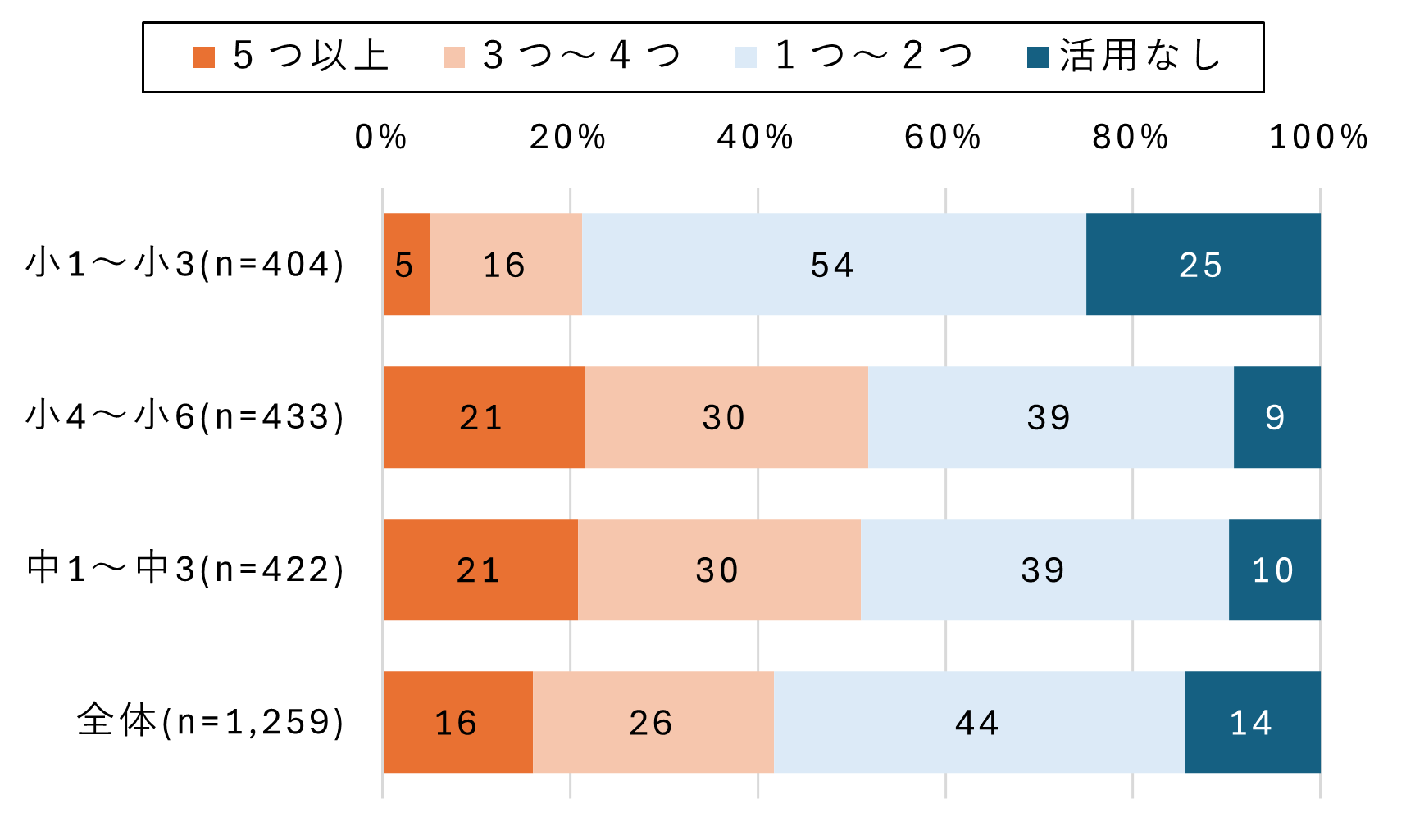 3. 活用項目数の平均は小学生低学年で1.5個、高学年・中学生は2.9個
