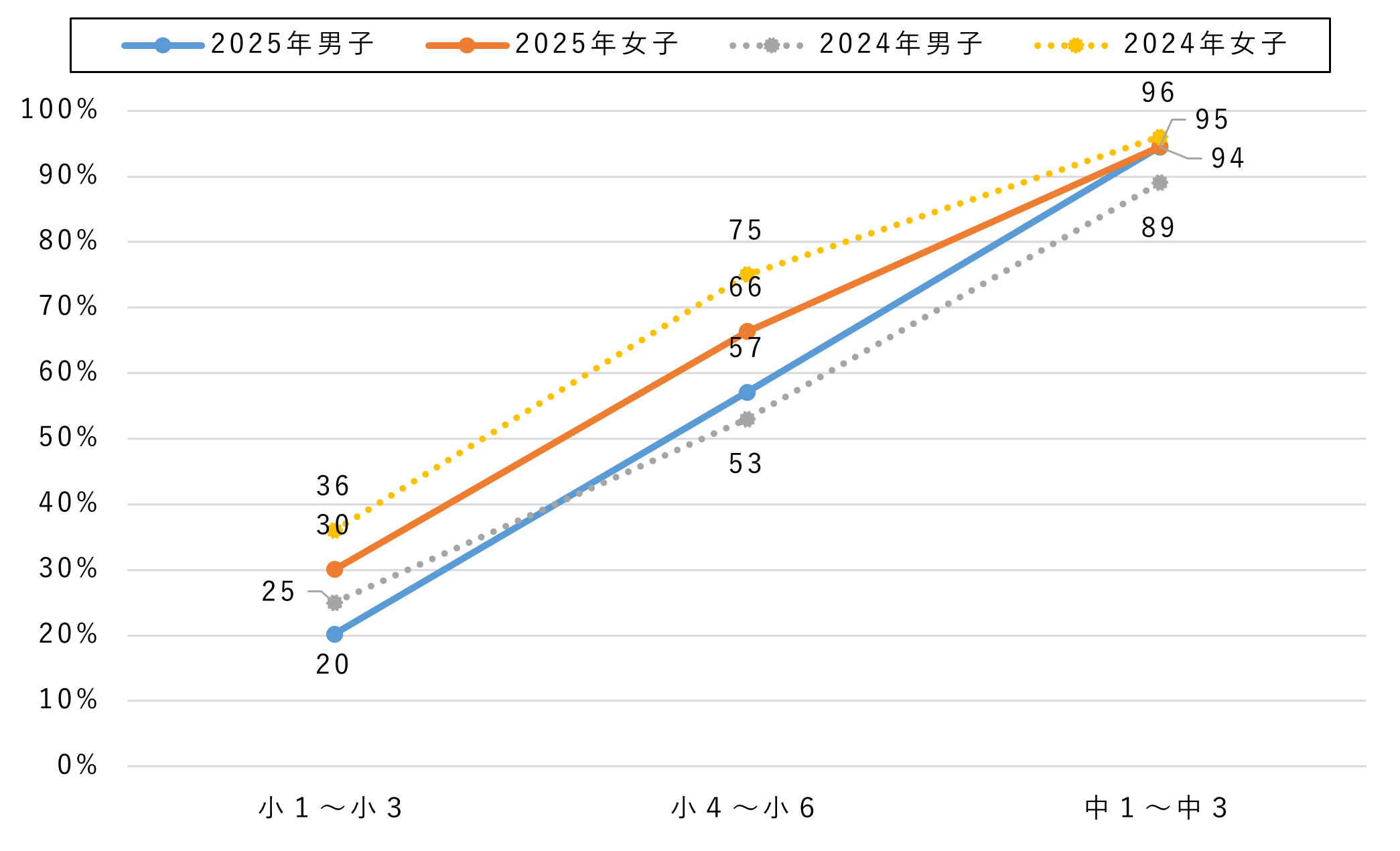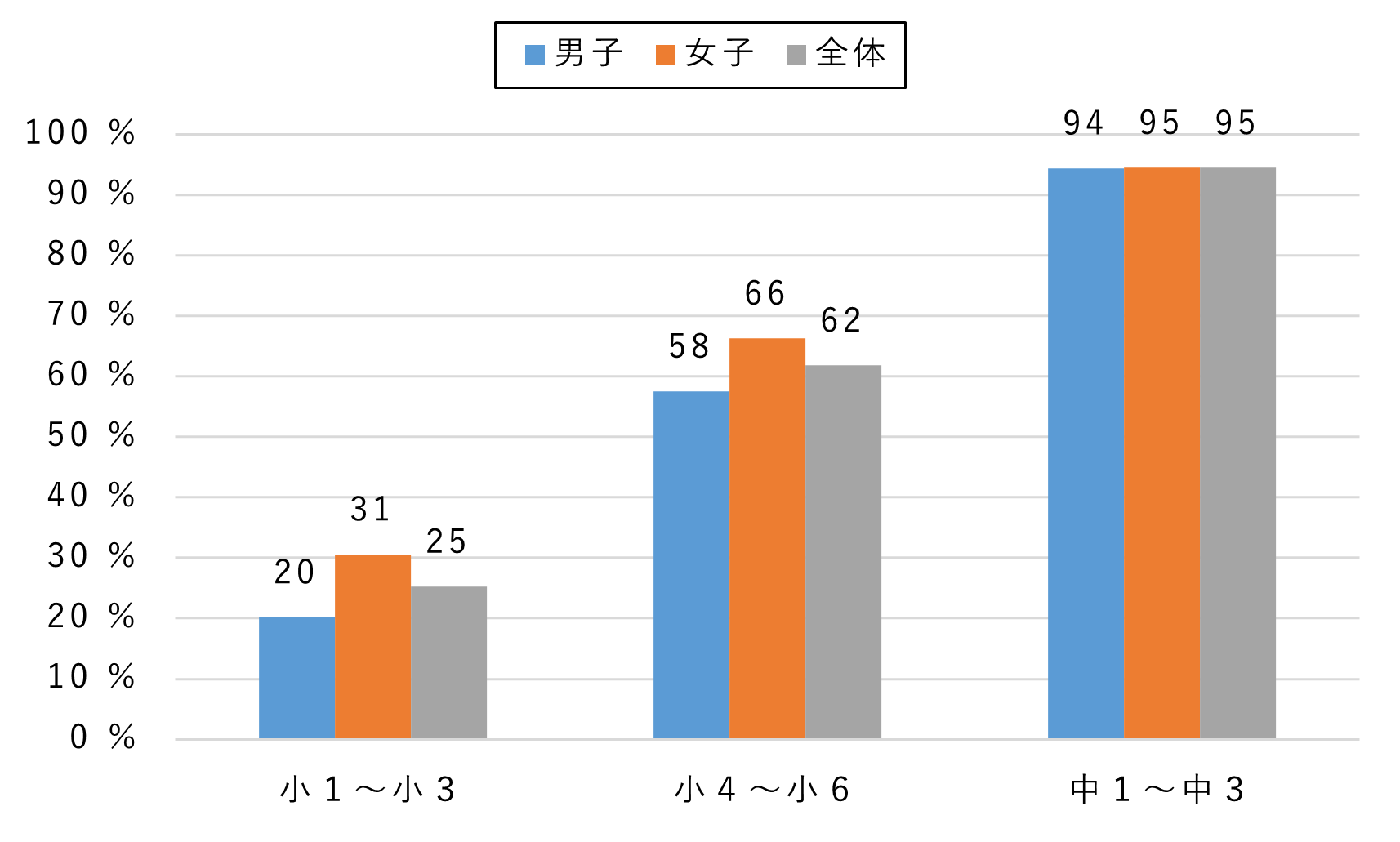 中学生女子では、1日あたりの平均利用時間が2時間以上の割合が約6割であり、男子(約4割)を上回っています。さらに中学生女子では、4時間以上利用する層と、1時間未満(未利用を含む)の層がそれぞれ約2割を占めており、利用時間の二極化が見られます。