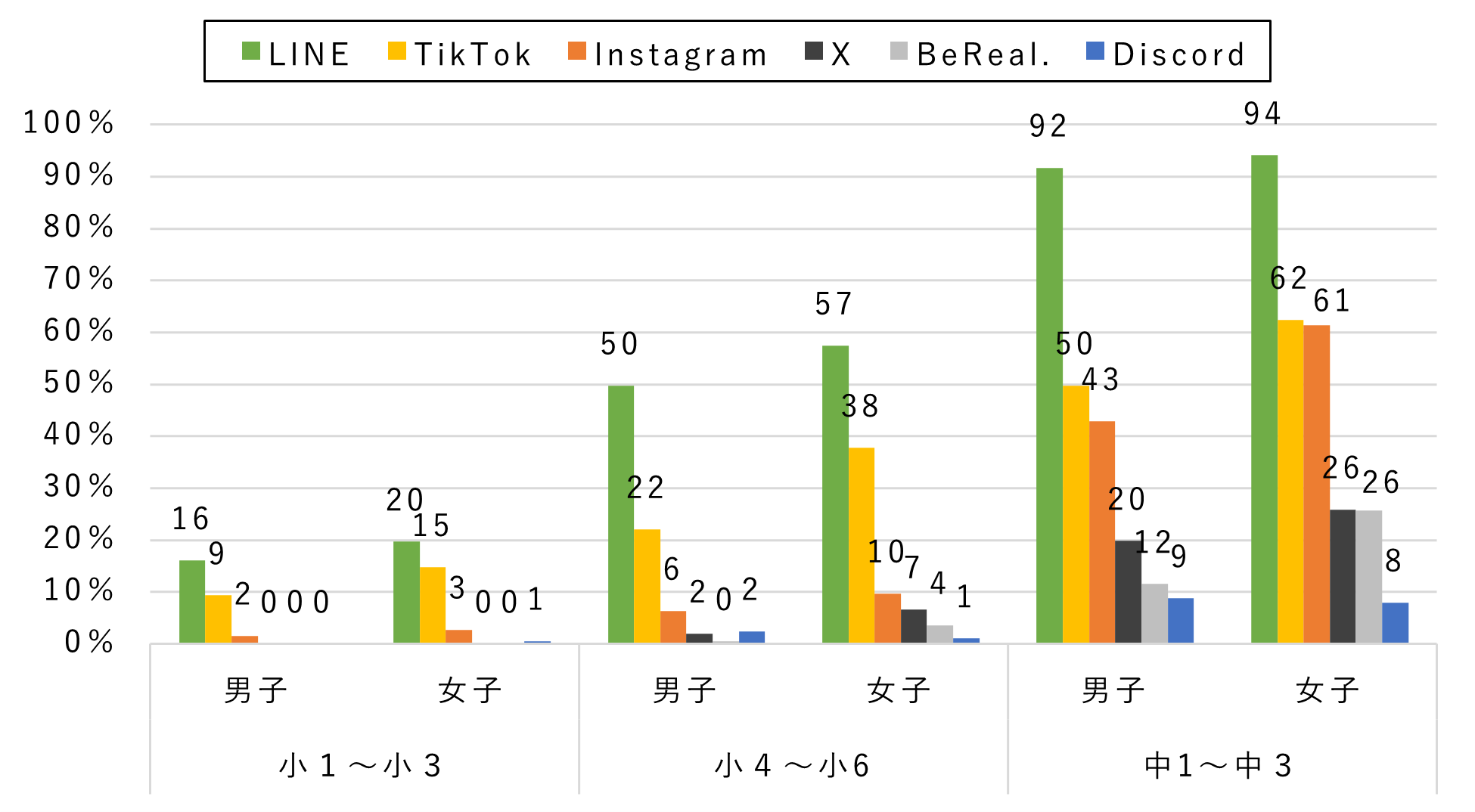 図1は、学年別のSNS利用率(LINE、TikTok、Instagram、X、BeReal.、Discordのいずれかを利用)を示したものです。同学年内では、いずれも男子より女子の利用率が高くなっています。小学生高学年で6割を超え、中学生になると9割を超える結果となりました。