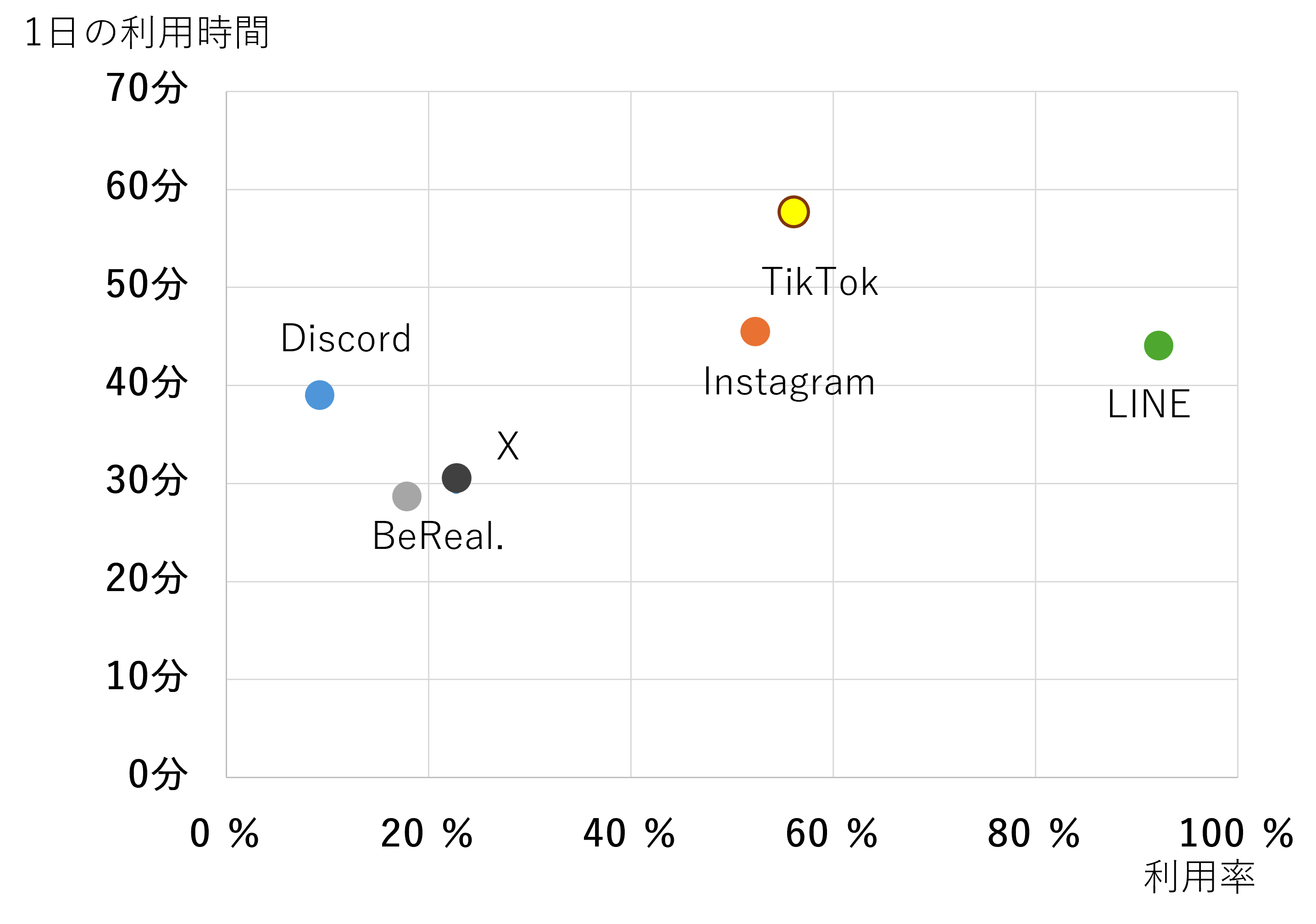 サービスごとの特徴は、図4において各サービス別の利用時間を、また図5では各サービスの利用率と利用者の1日あたりの利用時間をあわせて示しています(いずれも中学生)。