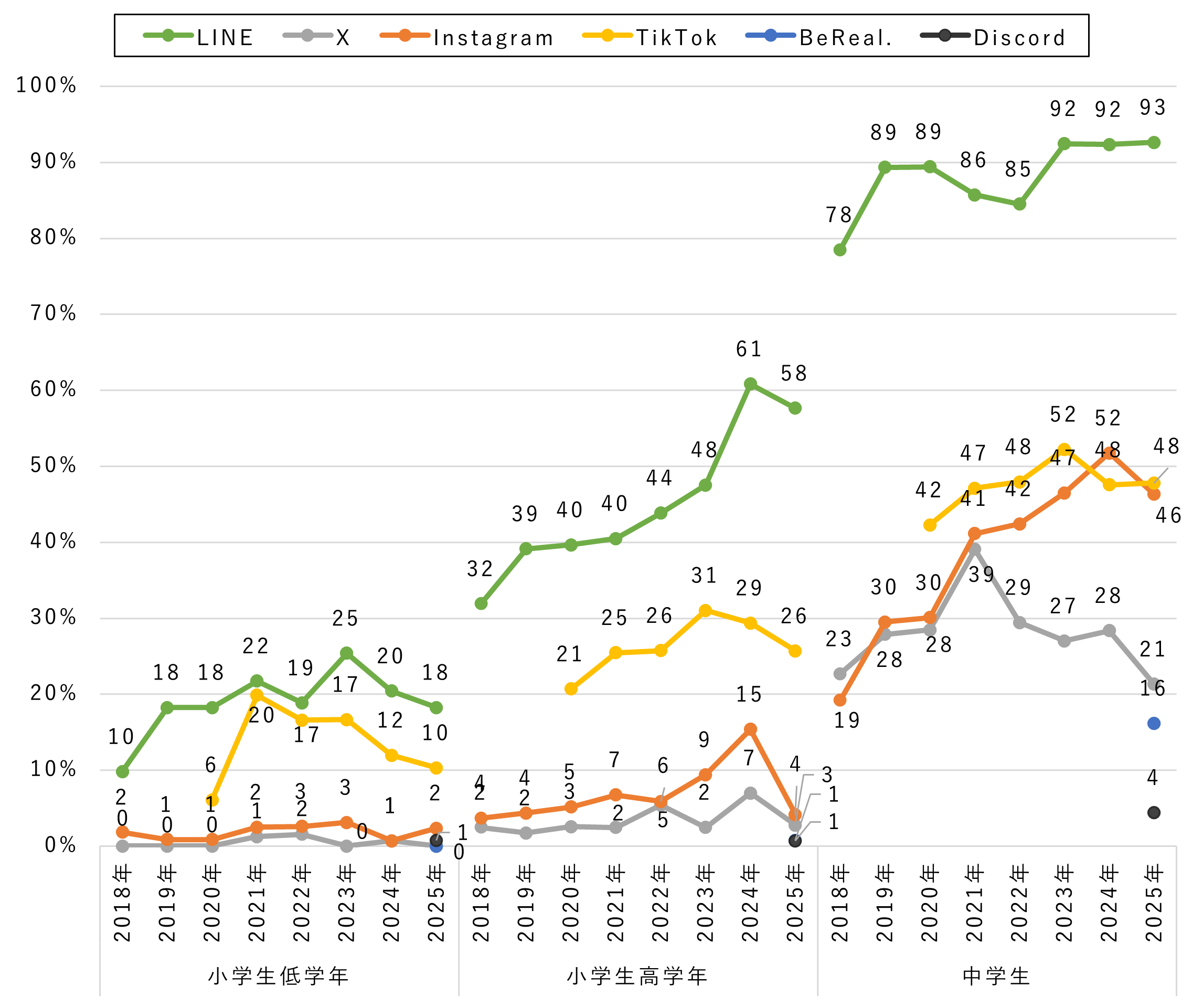 ※TikTokは2020年より、BeReal.とDiscordは2025年より調査