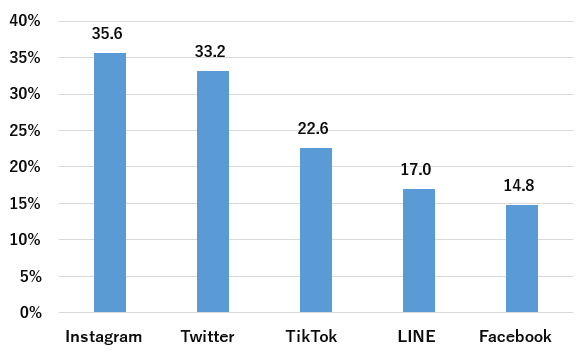 続けてどのような「SNS」から生活情報を得ているかを聞いたところ、Instagramが約4割、Twitterが約3割、TikTok、LINEが約2割でした。