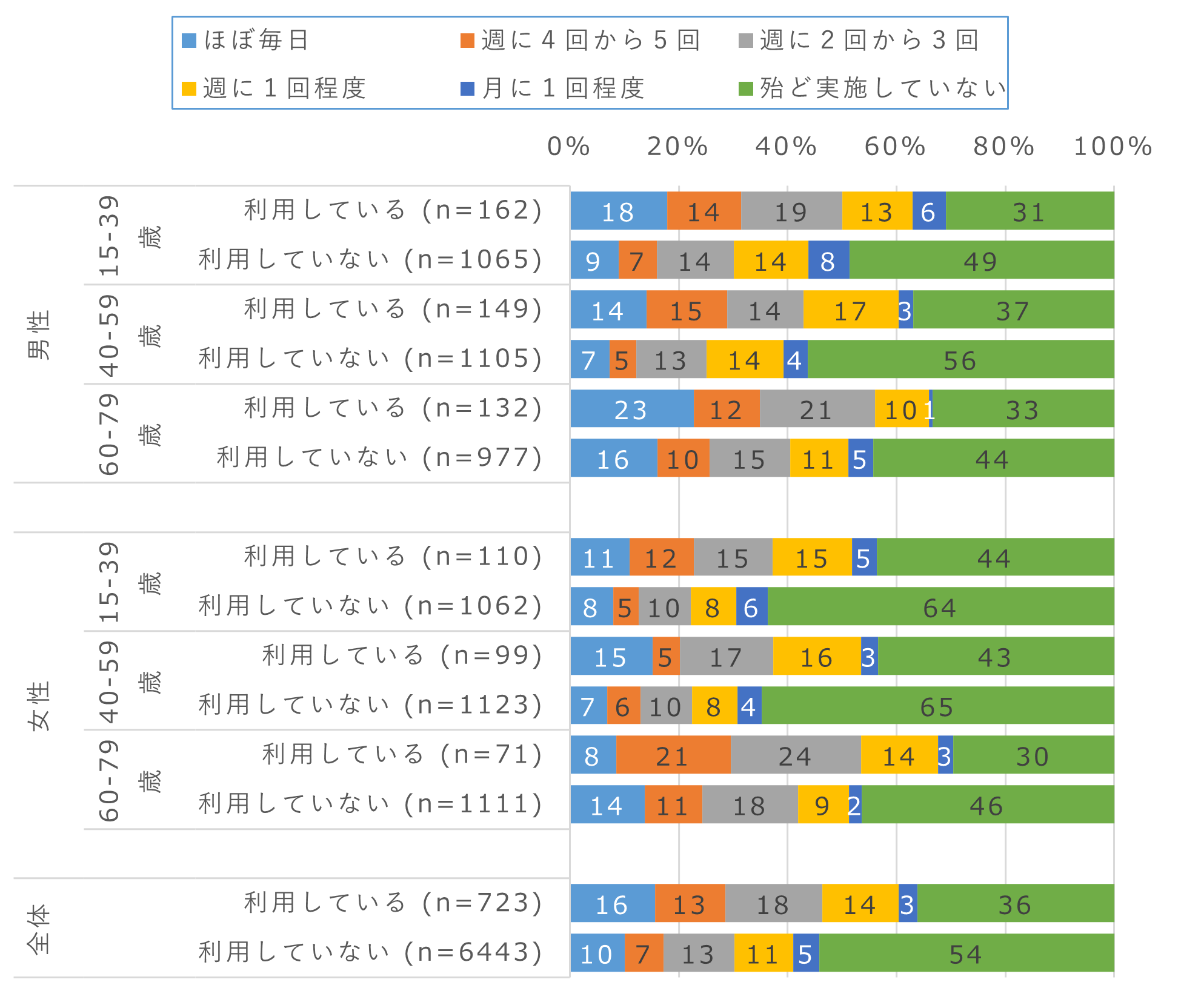 全体のデータに着目すると、スマートウォッチを利用する人の週1回以上の身体運動の割合は60%、スマートウォッチを利用していない人の場合41%となりました。