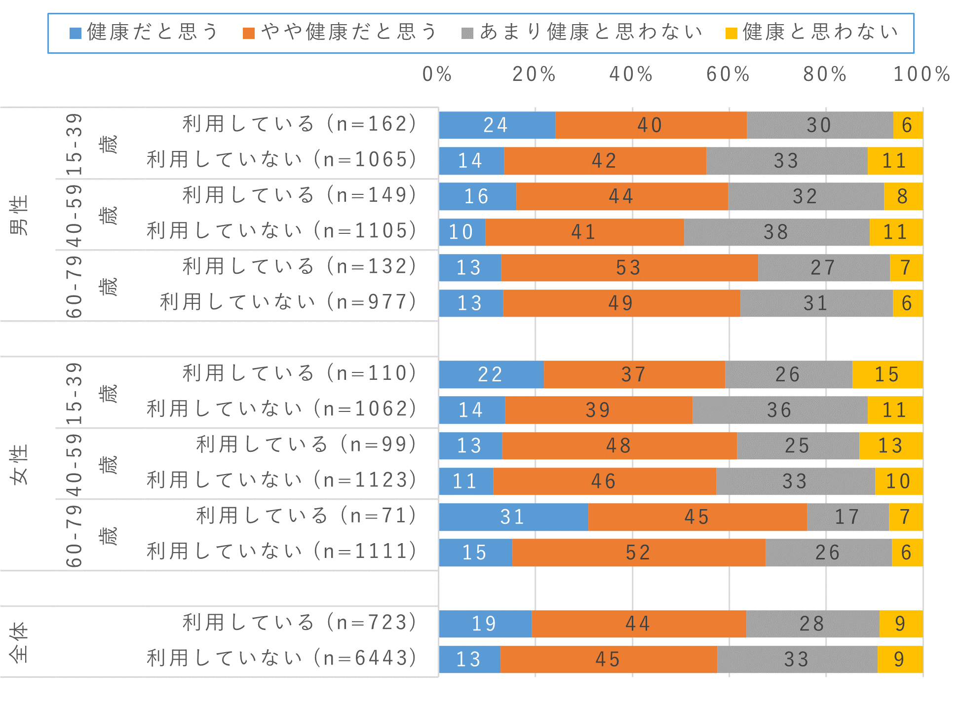 全体のデータに着目すると、スマートウォッチを利用する人のうち“健康に自信がある”と回答した割合は63%、スマートウォッチを利用していない人の場合は58%となりました。