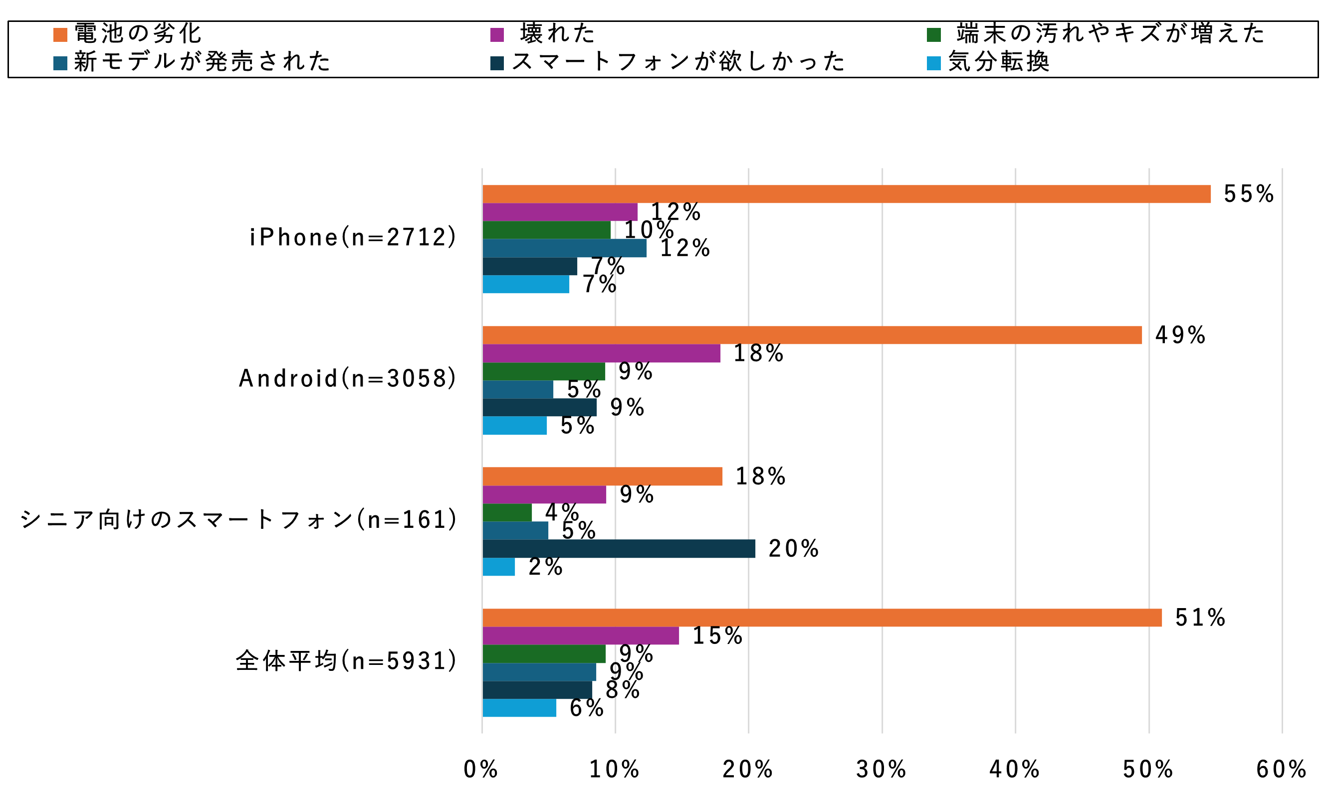 1. 新機種の購入きっかけ iPhoneとAndroidは「電池の劣化」が最多