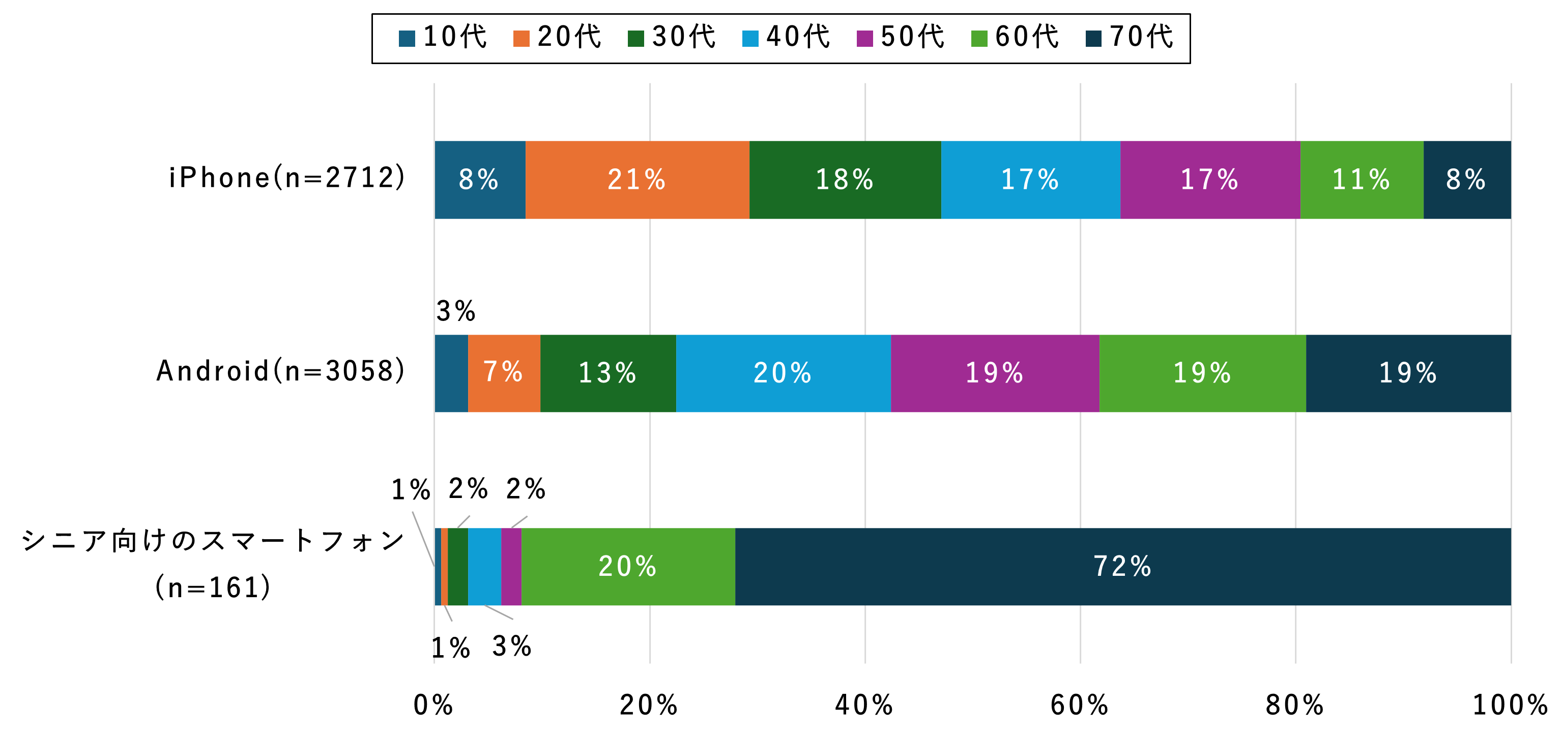 各利用機種の利用者の年代を見たところ、図2に示す通りiPhoneは10~30代までで47%と約5割であり、Androidの30代までの23%と比較して約24ポイントの差があり、若年層の利用が多くみられました。シニア向けのスマートフォンは70代が約7割、60代が約2割となっていました。シニアの利用機種については、2023年4月のレポートで詳しくレポートしていますので、こちらもご参照ください。