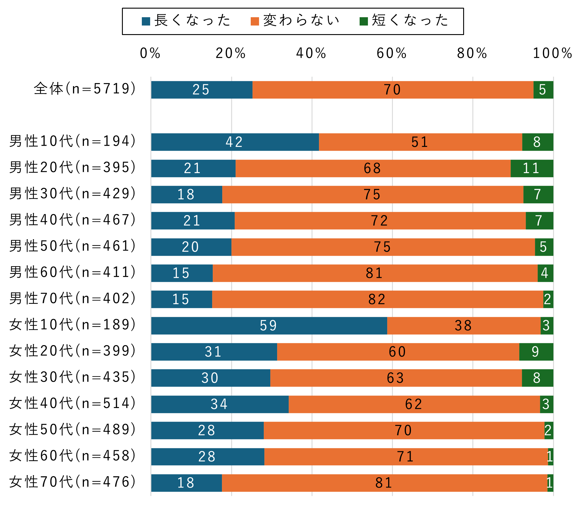 ※「長くなった」には「やり始めた」も含み、「短くなった」には「やめた」も含む