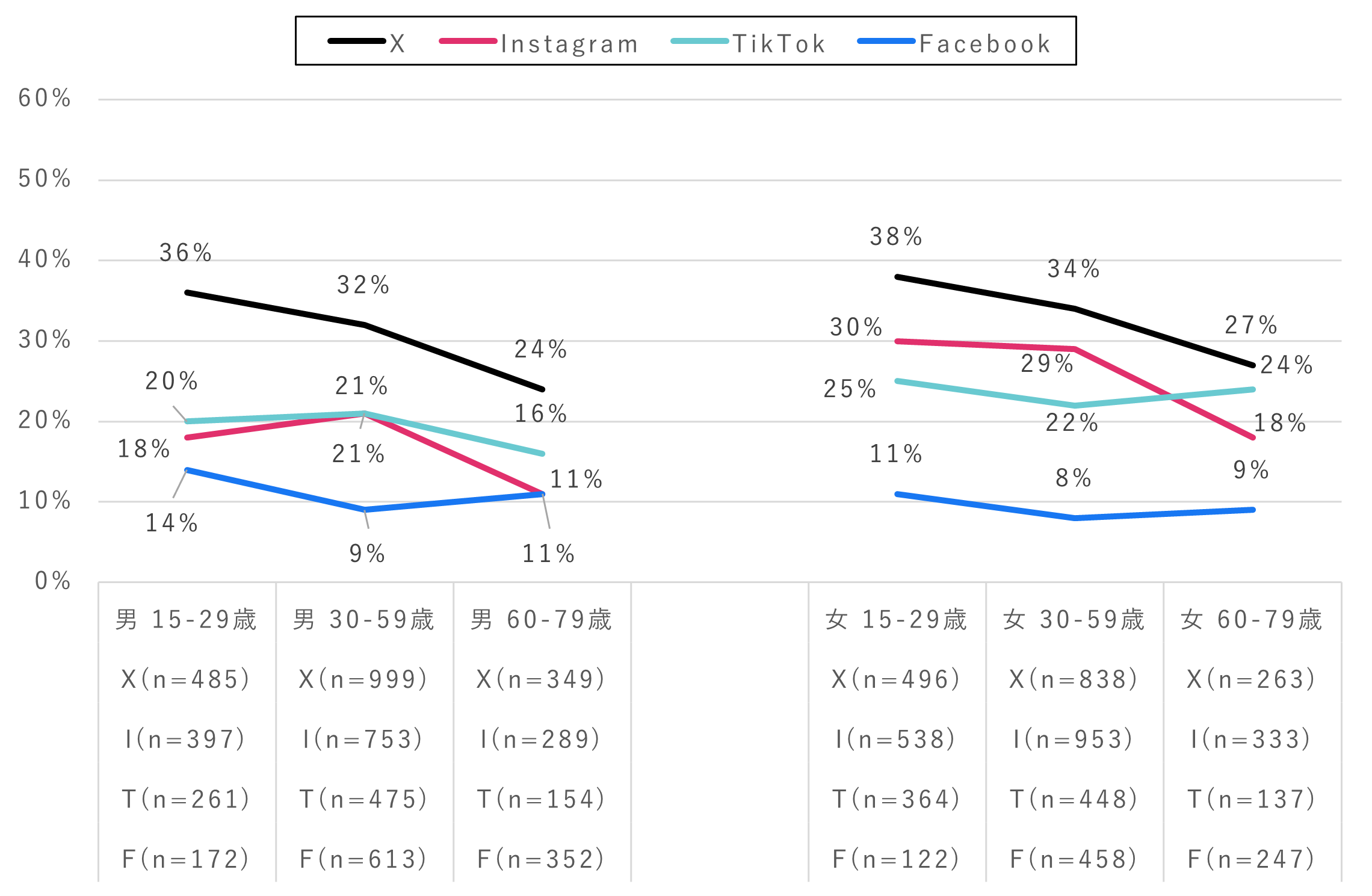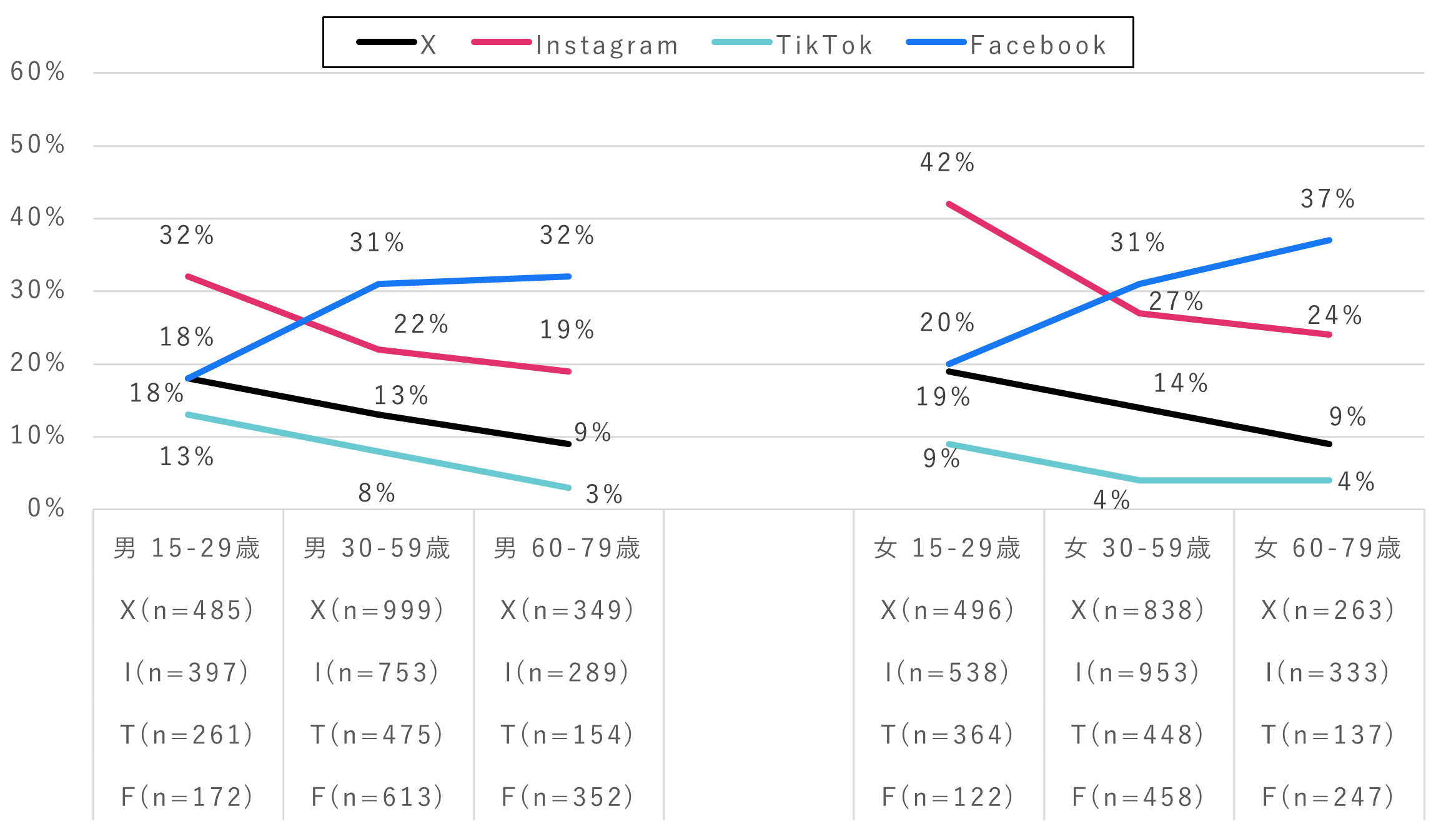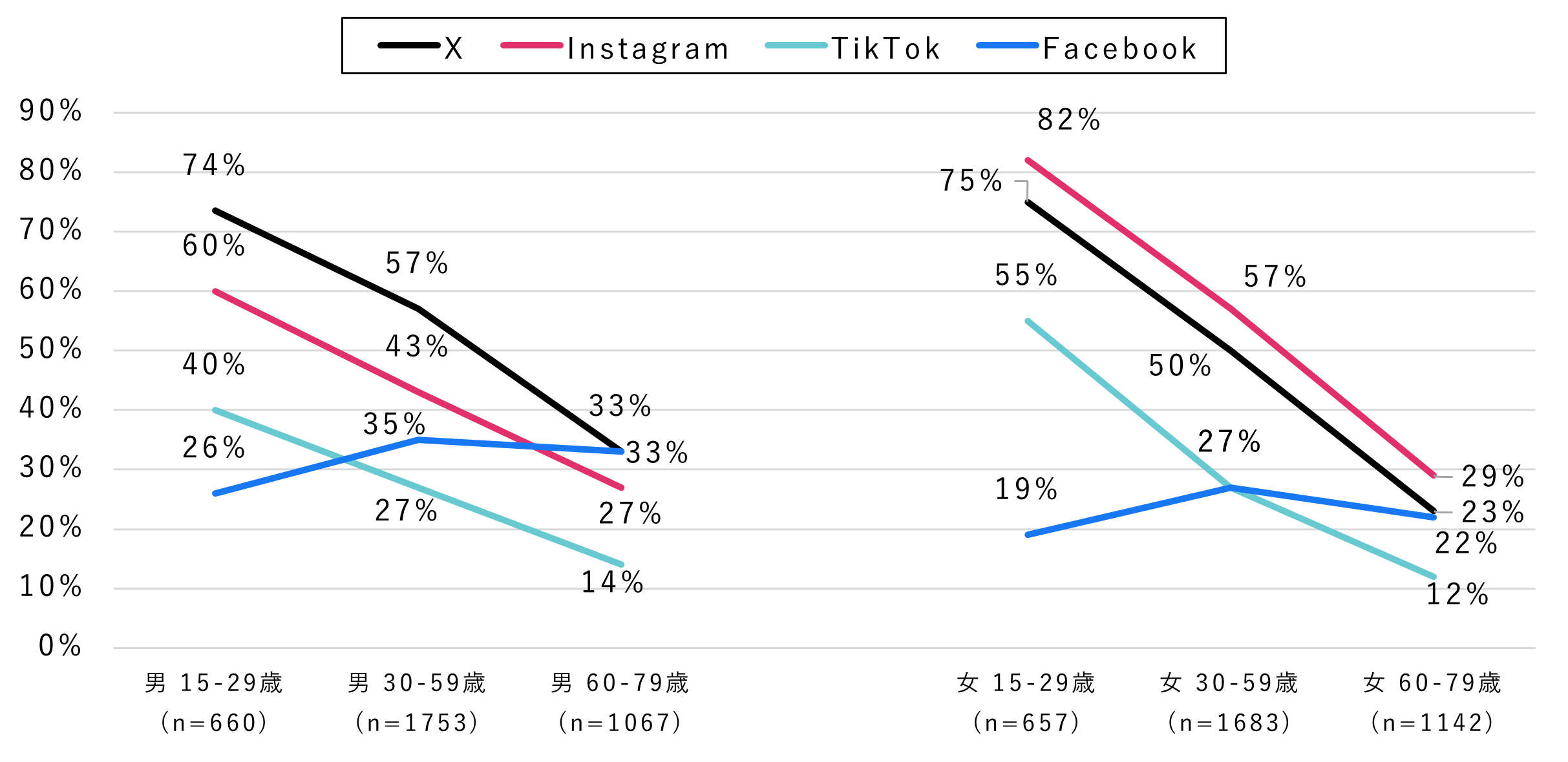 男性はX、女性はInstagramの利用率が高い - 男女ともにX,Instagram,TikTokは若い世代 Facebookは中高年層の利用率が高い