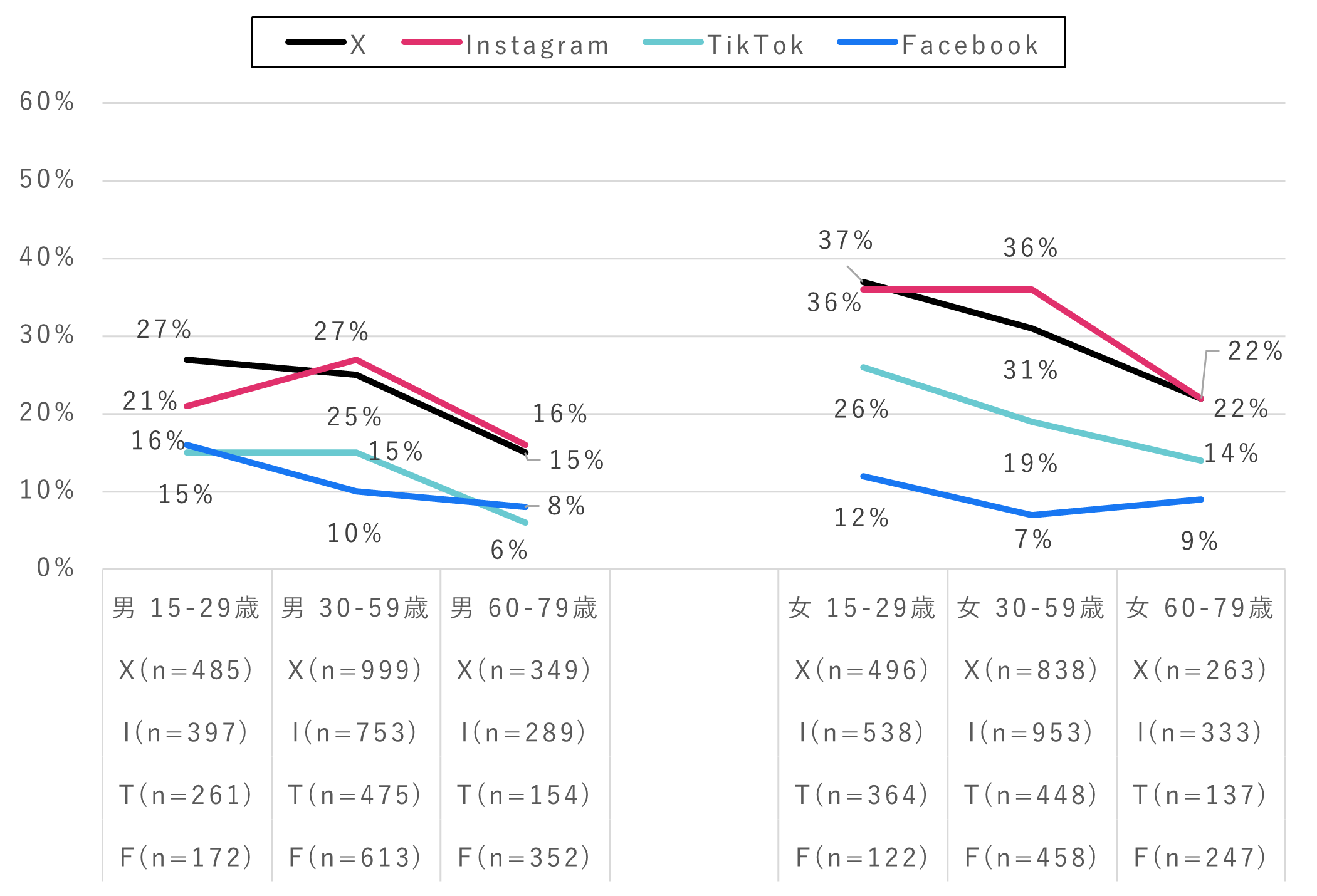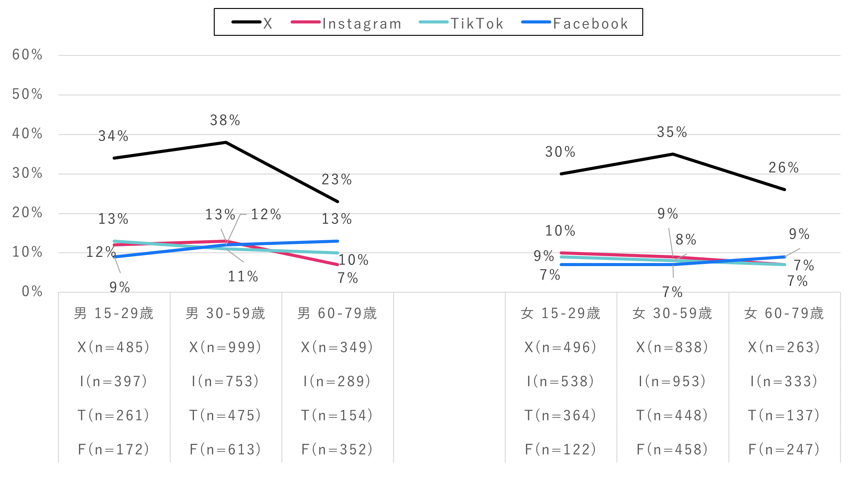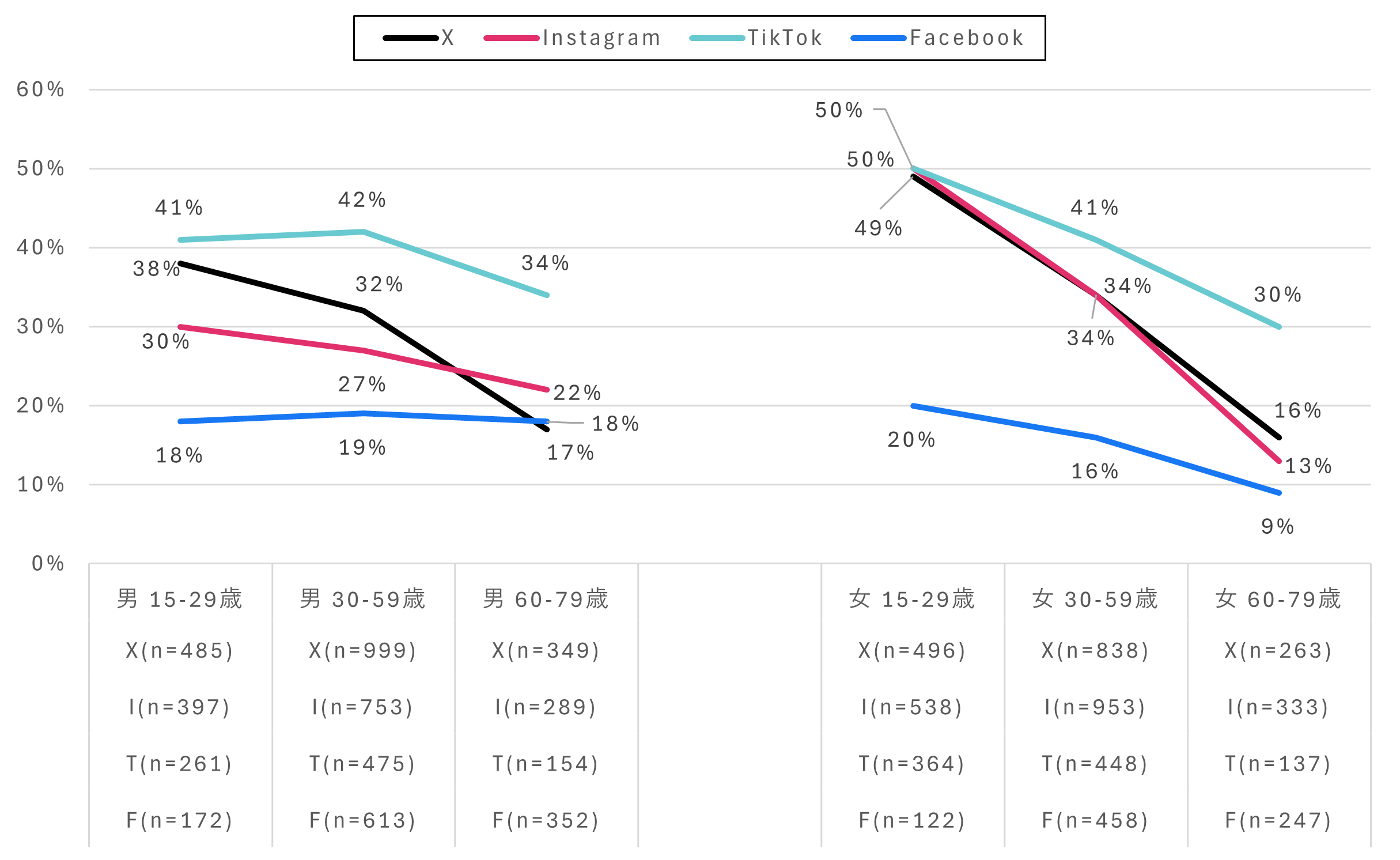 男性はX、女性はInstagramの利用率が高い - 男女ともにX,Instagram,TikTokは若い世代 Facebookは中高年層の利用率が高い