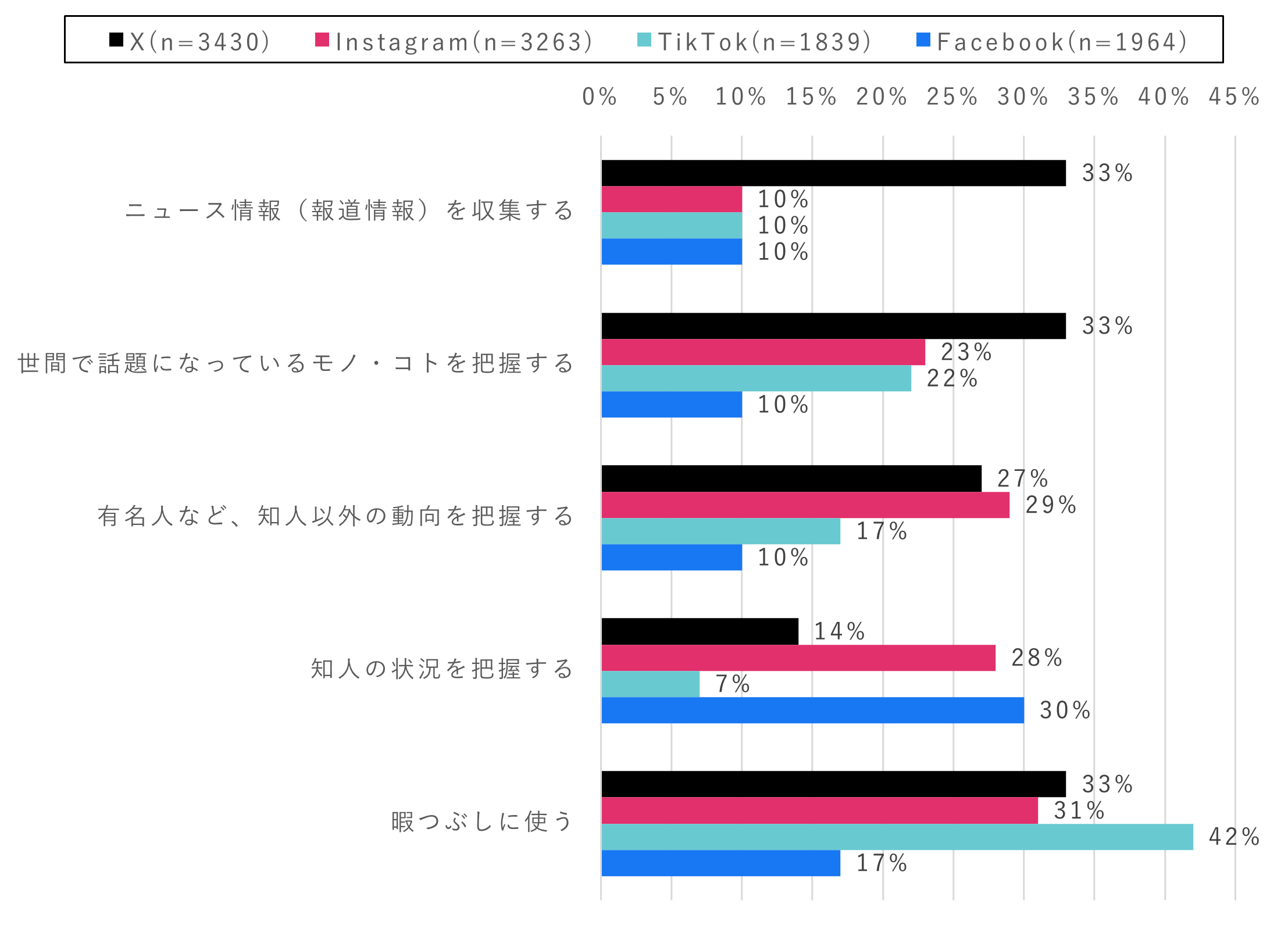 - 主な使い方 X 「ニュース・話題なことを調べる」、Instagram 「有名人・知人の動向把握」、TikTok 「暇つぶし」、Facebook 「知人の動向把握」