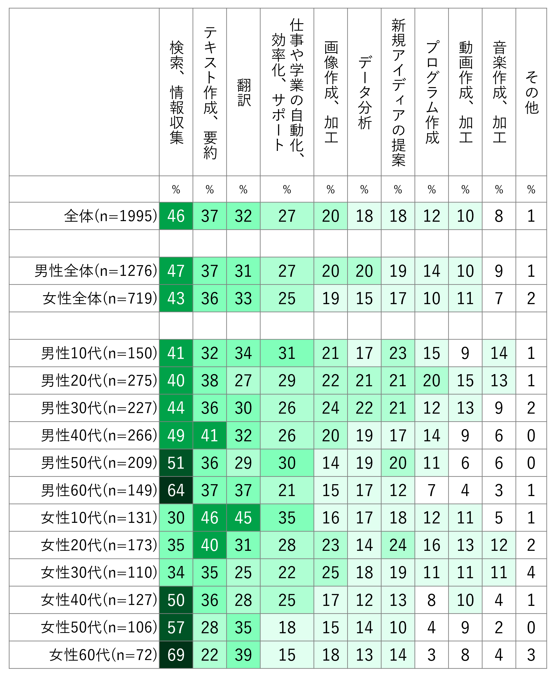 1. 生成AIの利用用途は「検索、情報収集」46%、「テキスト生成、要約」37%、「翻訳」32%
