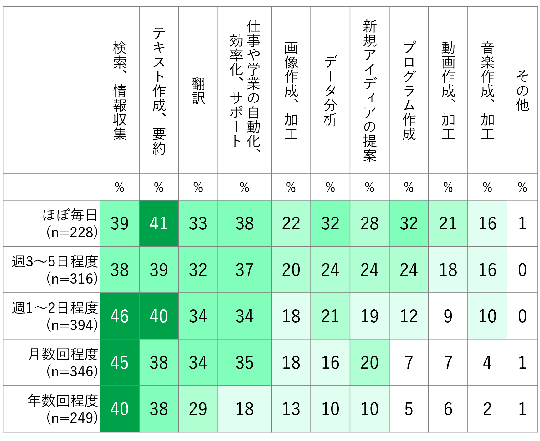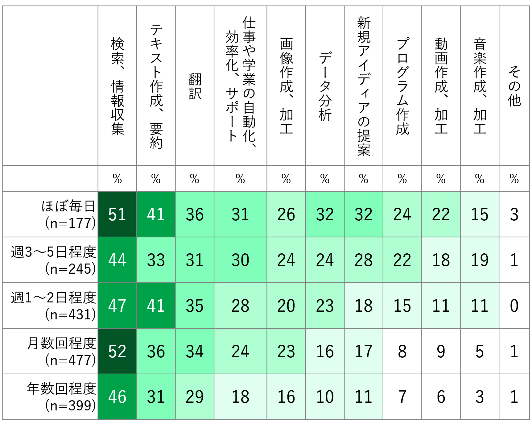 その結果、仕事、学業での生成AIの利用頻度が高い人は、幅広い用途で生成AIを活用している傾向が見られました (図3-1)。