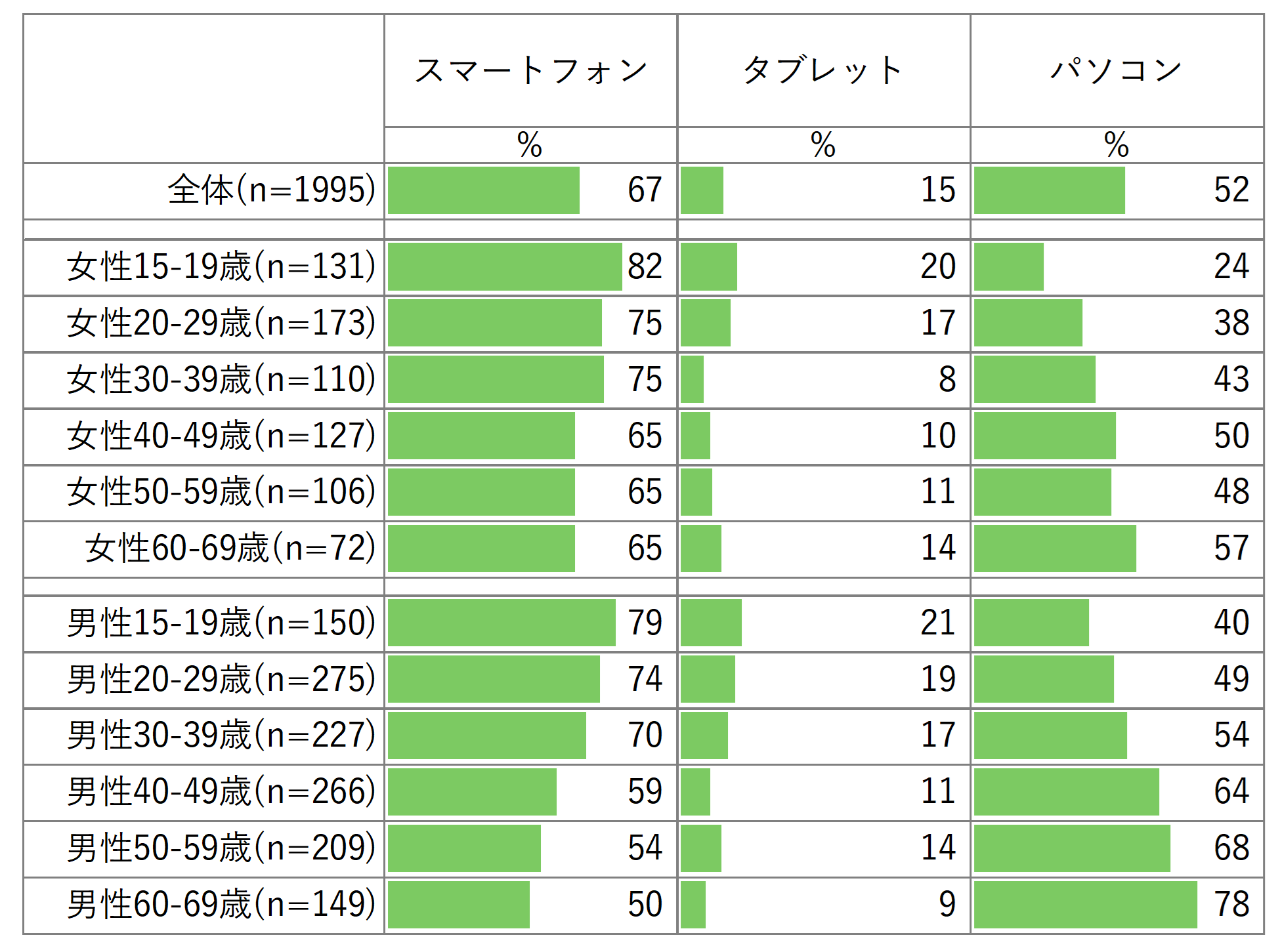 その結果、生成AIを使っている人のうち、67%が「スマートフォン」、15%が「タブレット」、52%が「パソコン」で生成AIを利用していました(図1-1)。また、生成AIを使っていない人も含めた割合は図1-2にまとめています。