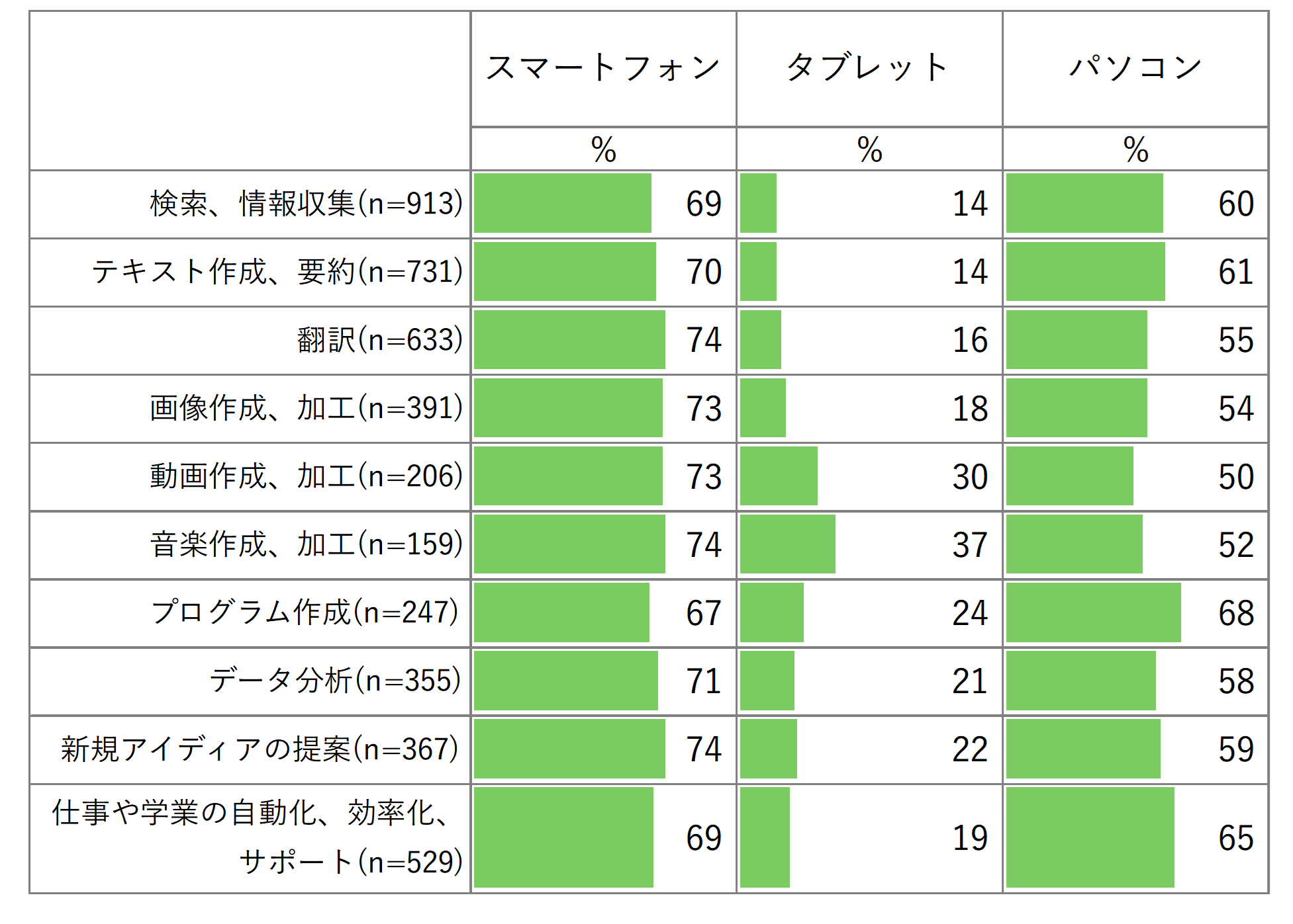 続いて、生成AIの利用用途別に、どの端末で生成AIを利用しているかを集計しました(図2)。