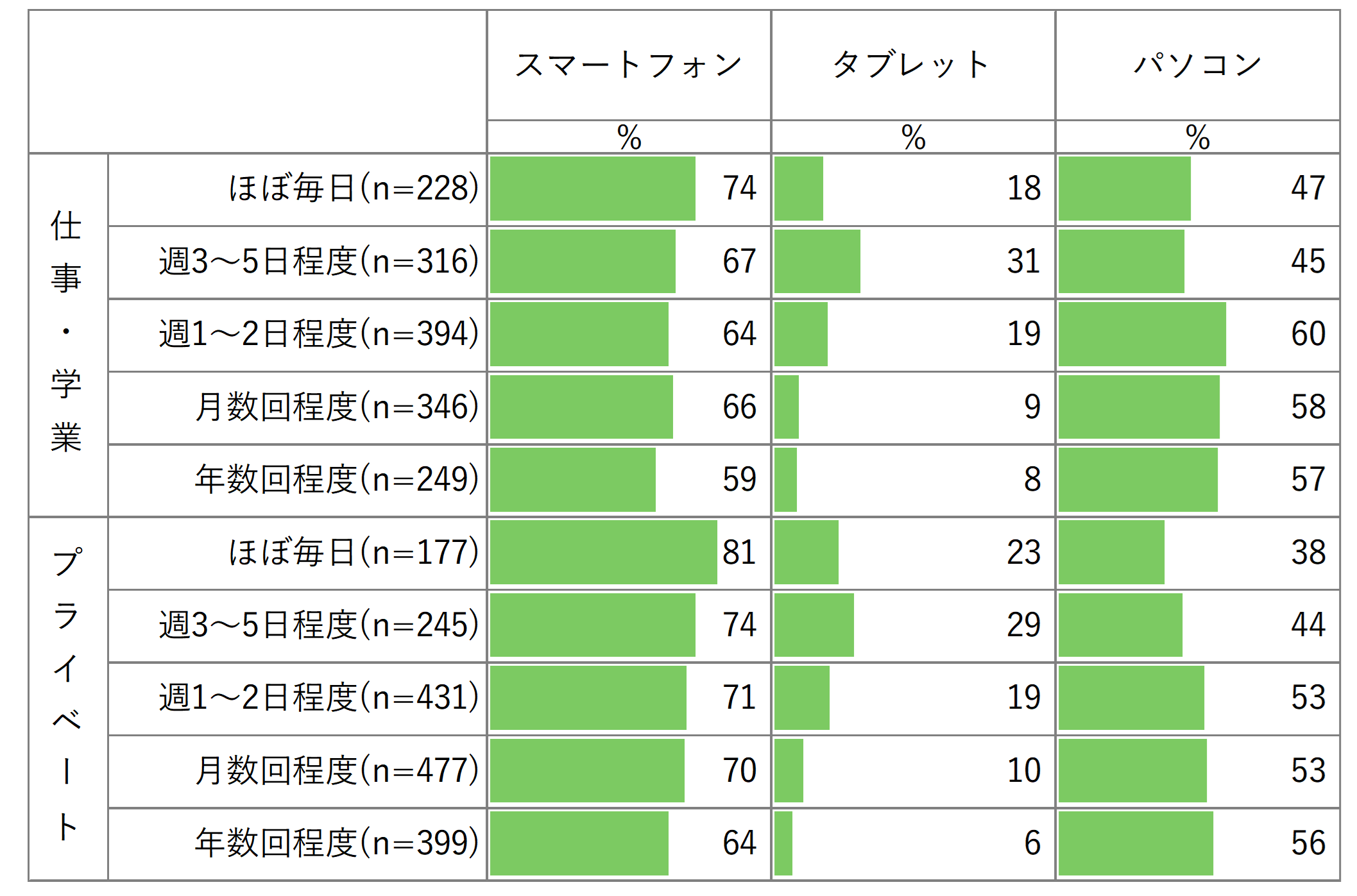 それでは生成AIの利用頻度によって扱う端末は異なるのでしょうか。「仕事・学業」および「プライベート」での生成AIの利用頻度別にどの端末で生成AIを利用しているかを集計しました(図3)。