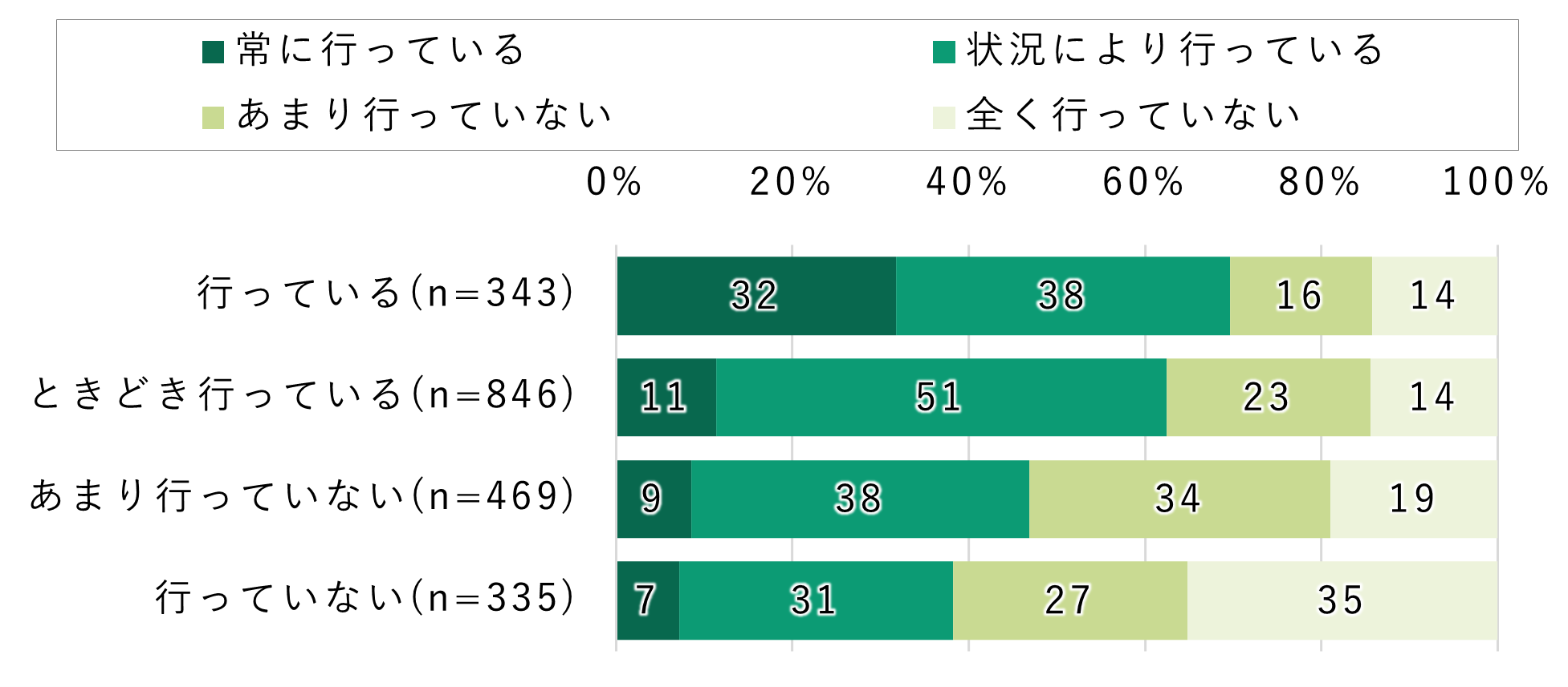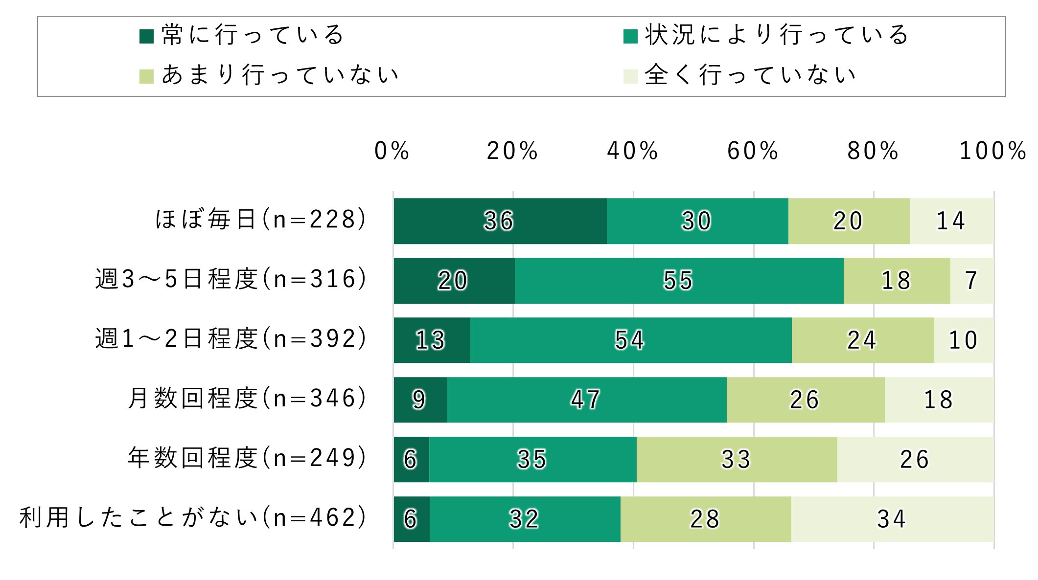 続いて、仕事や学業での生成AIの利用頻度別に集計をしたところ(図2-1)、利用頻度が多いほどファクトチェックを「常に行っている」という回答が多くなる傾向がみられました。