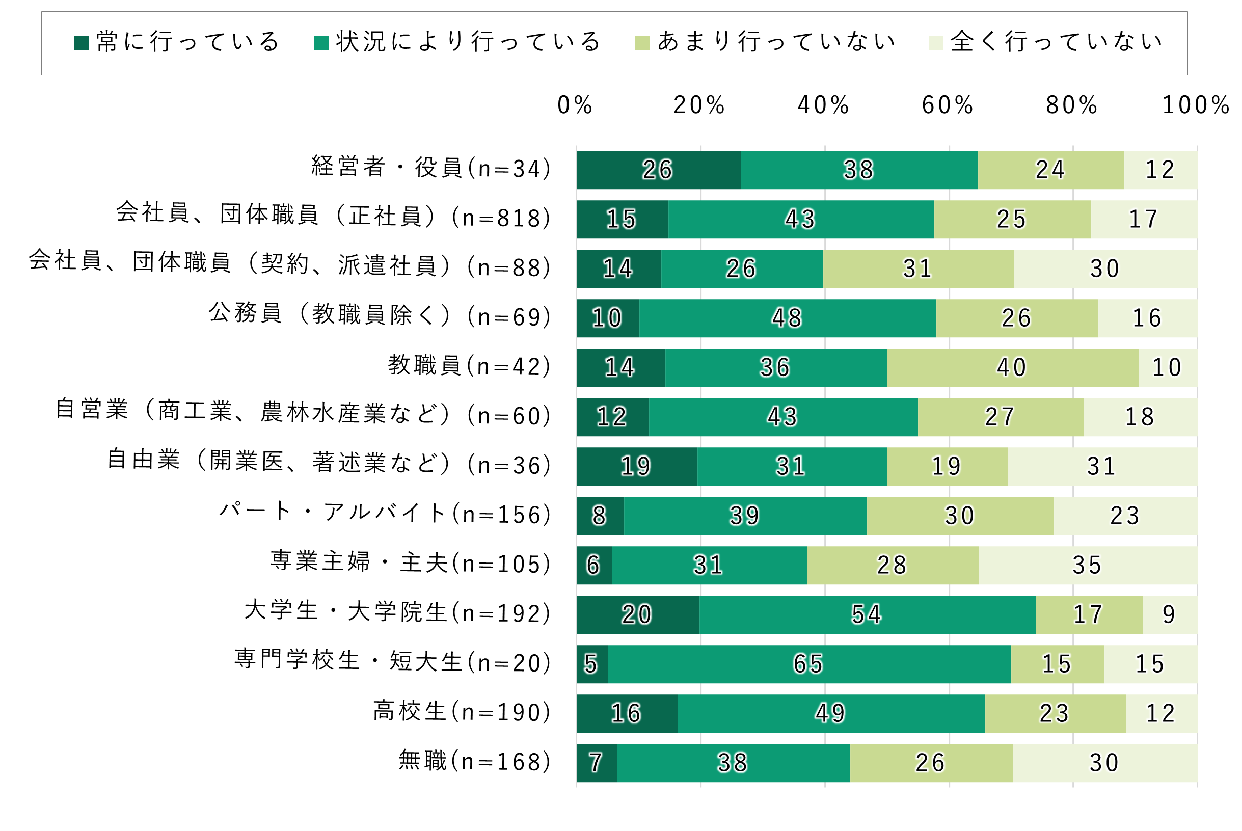 職業別にファクトチェック実施状況を集計したところ(図2-2)、大学生、高校生、経営者・役員、会社員ではファクトチェックを行っていると回答した割合が高い傾向が見られ、仕事や業務で頻繁に生成AIを活用している職業ほどファクトチェックについても行っている可能性が伺えました。