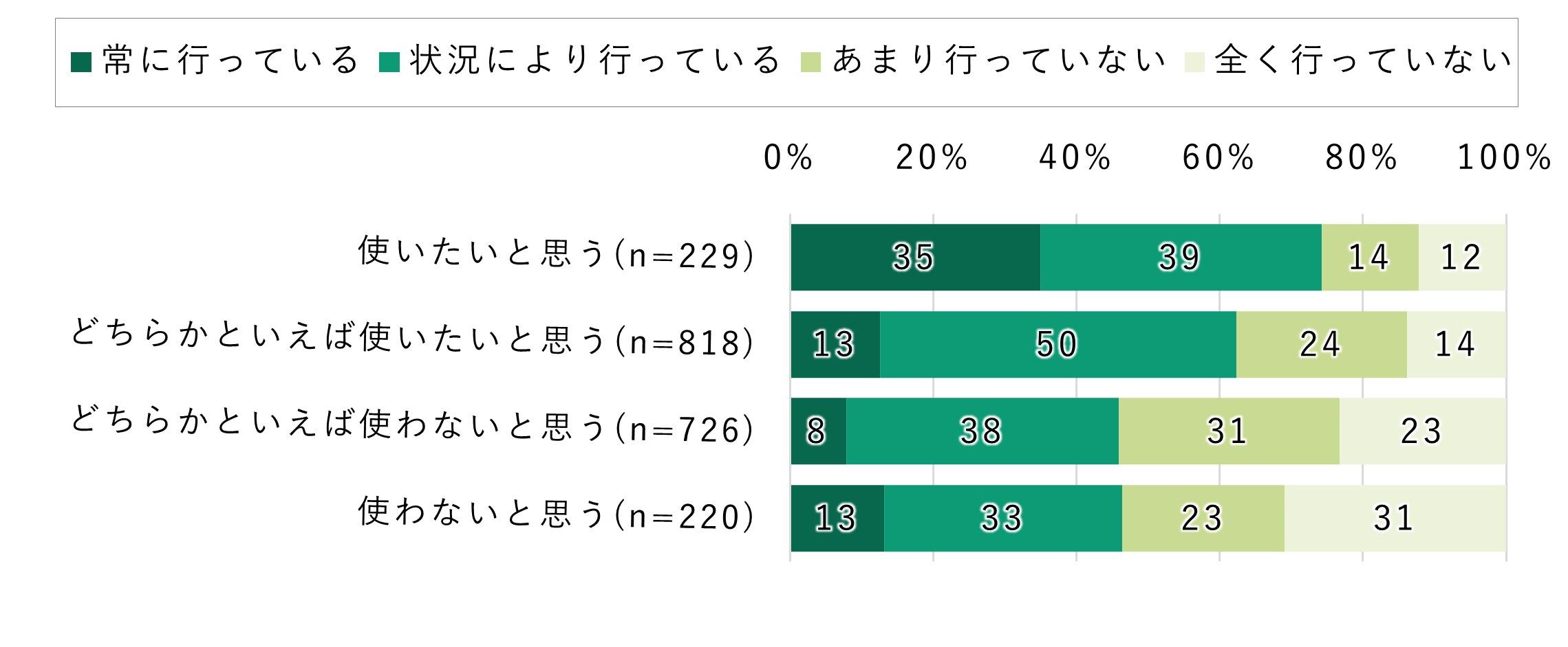それでは、どのような性格やライフスタイルの方が生成AIのファクトチェックを行っているのでしょうか。「あなたはお金と時間を他人のために使いたいと思いますか?」という質問への回答別に集計したところ、「使いたいと思う」と答えた方ほど、ファクトチェックを行っている割合が高い傾向がありました(図3-1)。