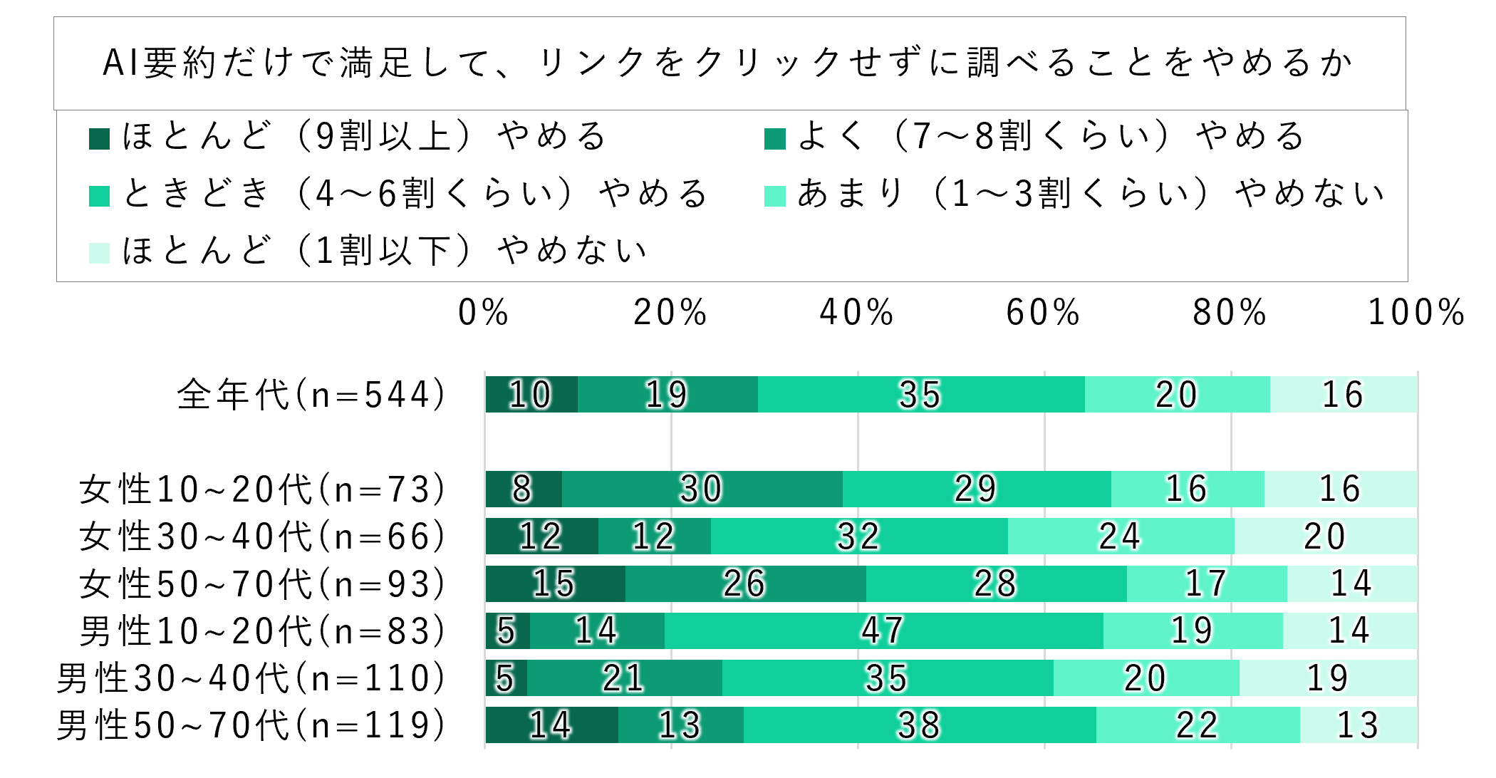 さらに、10~20代女性と50~70代女性は「ほとんどやめる」と「よくやめる」を合わせた割合が約4割となり、他の年代よりゼロクリック検索の実施率が高い傾向が見られました。