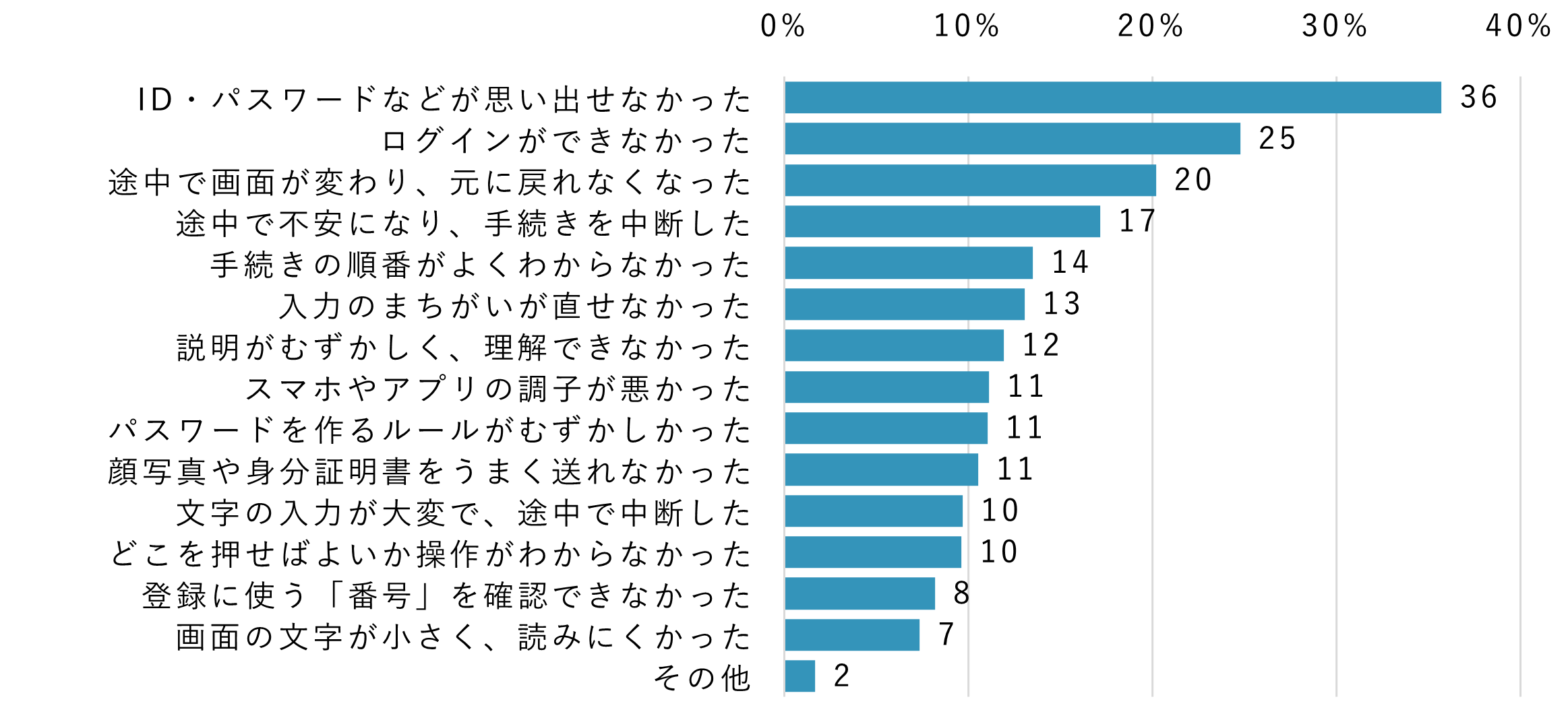 それでは、スマートフォンやパソコンでの手続きがうまくいかなかった理由は何でしょうか?集計をしたところ「ID・パスワードなどが思い出せなかった」が36%と最も多く、次いで「ログインができなくなった」が25%でした。この結果から、ログインに必要な情報が分かりにくい、または思い出せないことが、手続きにつまずく主な原因であると考えられます(図2-1)。