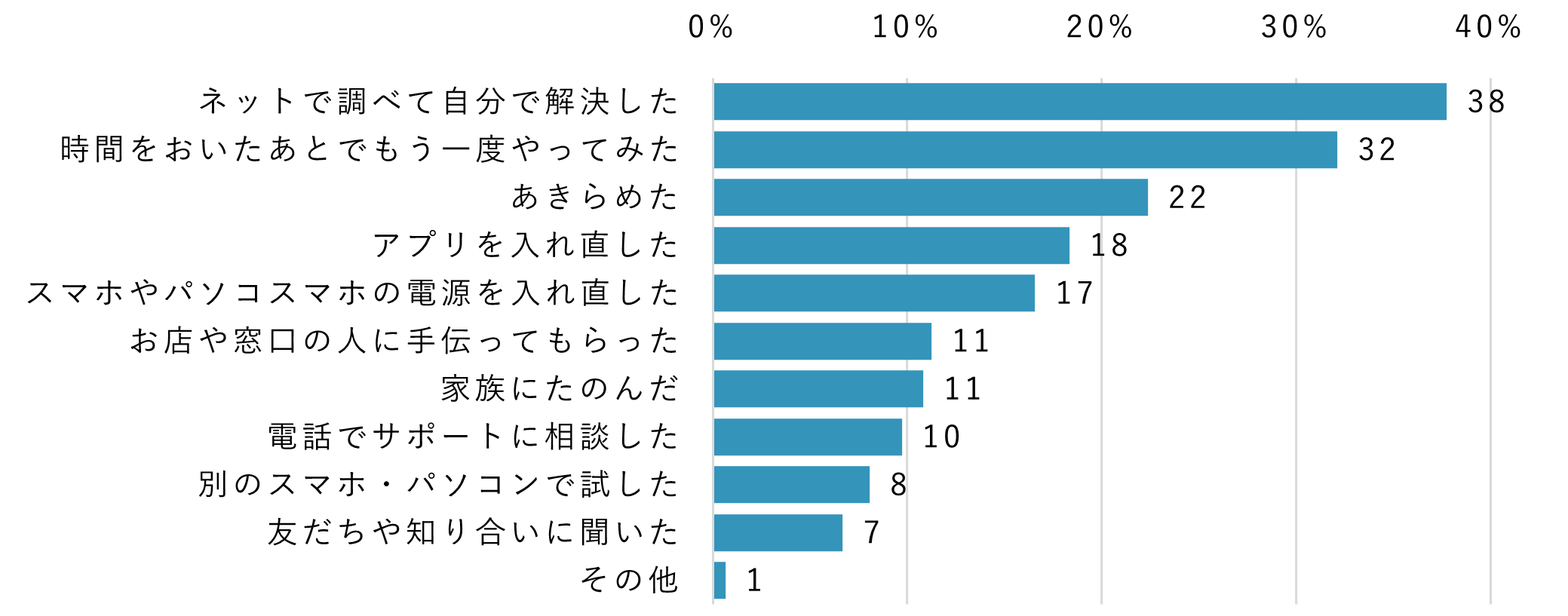 続いて、スマートフォン・パソコンでの手続きがうまくいかなかった際の解決方法を伺ったところ「ネットで調べて自分で解決した」が38%と最も多く、次いで「時間をおいたあとでもう一度やってみた」が32%、「あきらめた」が22%でした(図2-2)。多くの人が自力で解決を試みる一方、約2割は途中で手続きを断念している実態がうかがえます。