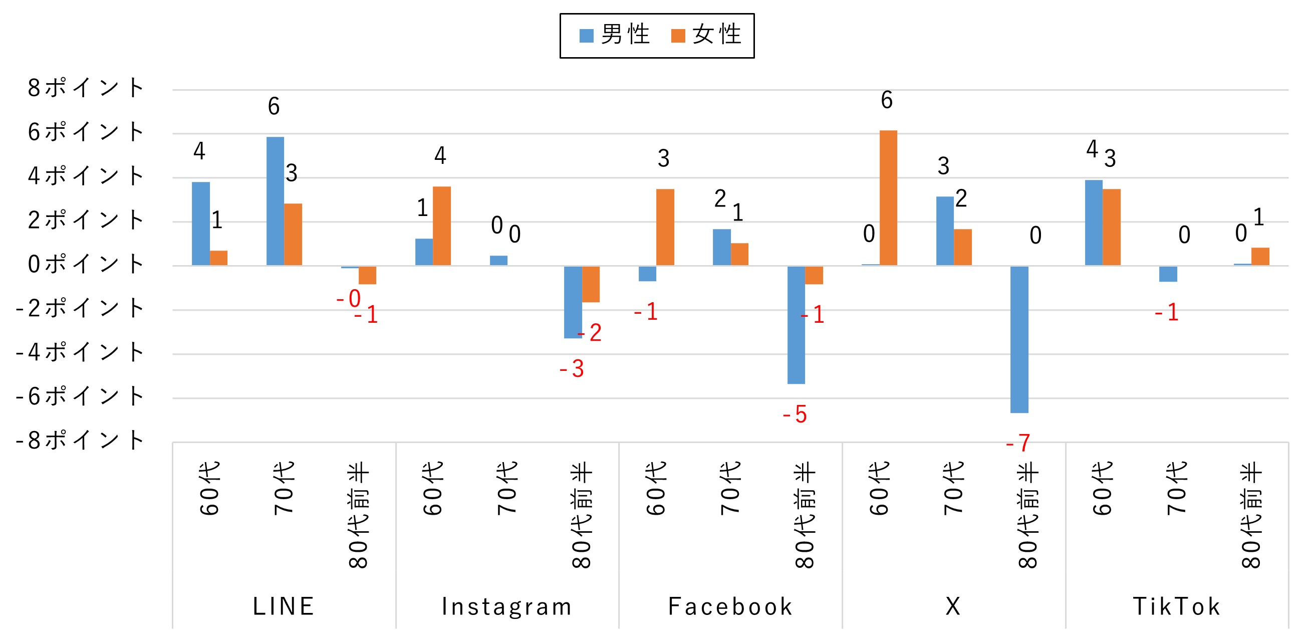 前年の利用率と比べたものが図3です。この1年で、70代男性のLINE、60代女性のXは、ともに5ポイント以上利用率が上昇しました。