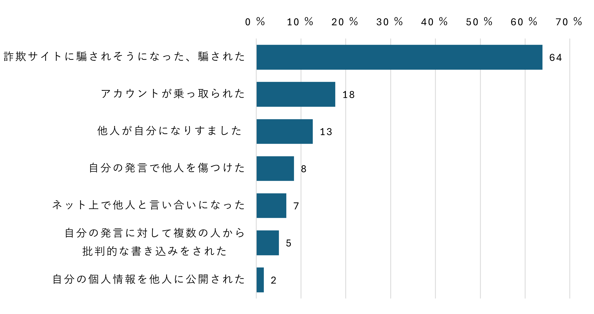 次に、トラブルの経験内容について聞きました。経験があると回答した人の中では、「詐欺サイトに騙されそうになった、または実際に騙された」というケースが最も多く、6割を超えました。