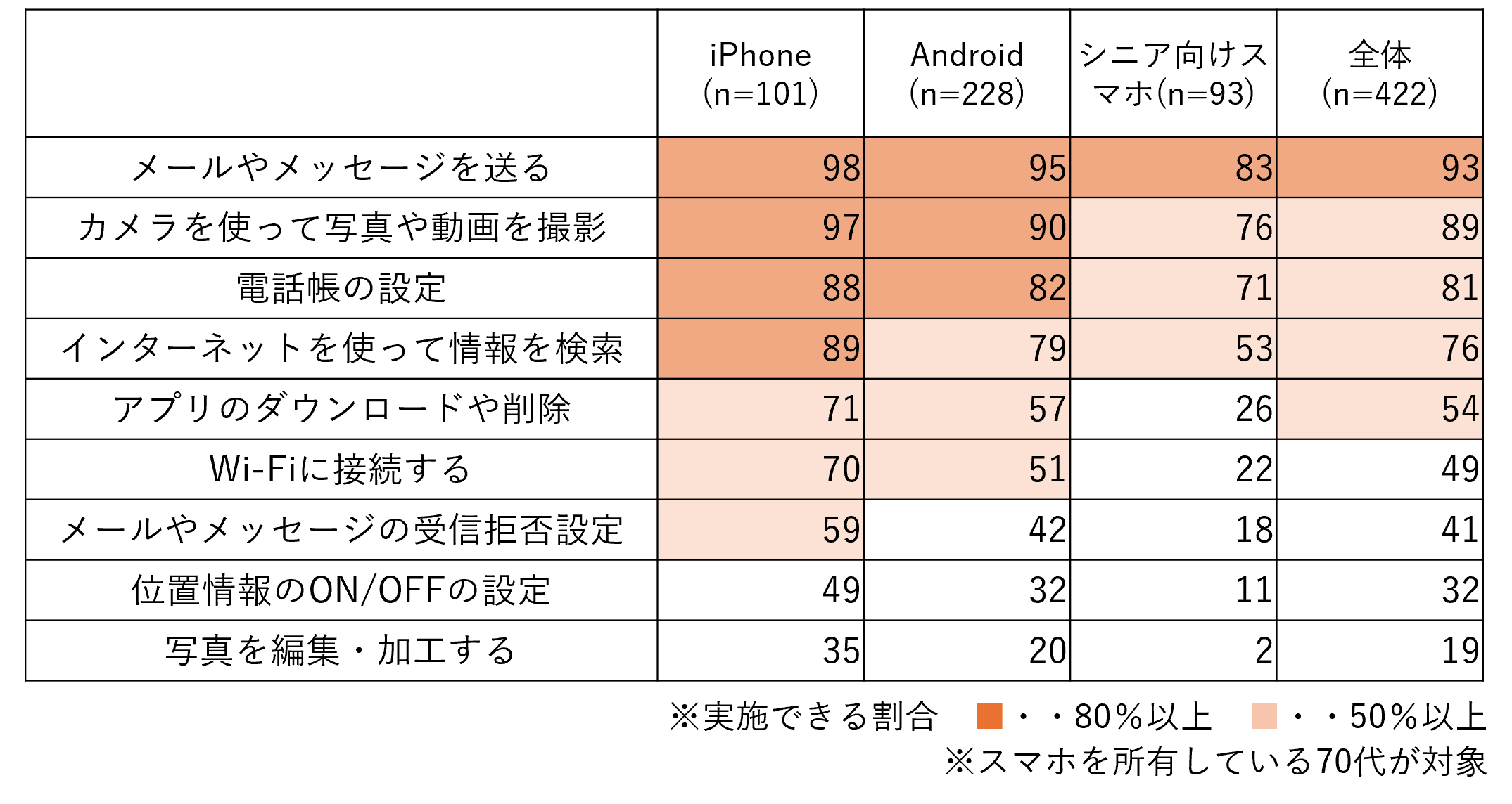表2. 70代スマホで実施できる操作(スマホの種類別)%