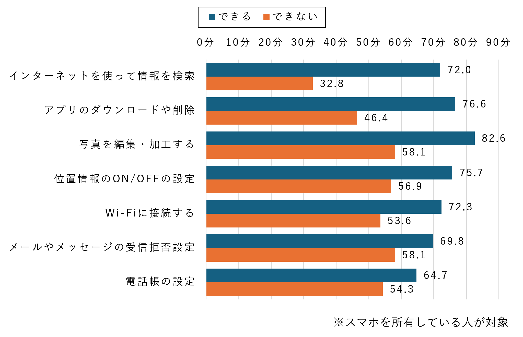 このようにスマホの操作の実施可否は、スマホの利用時間・使いこなしにも影響を与えている可能性があります。