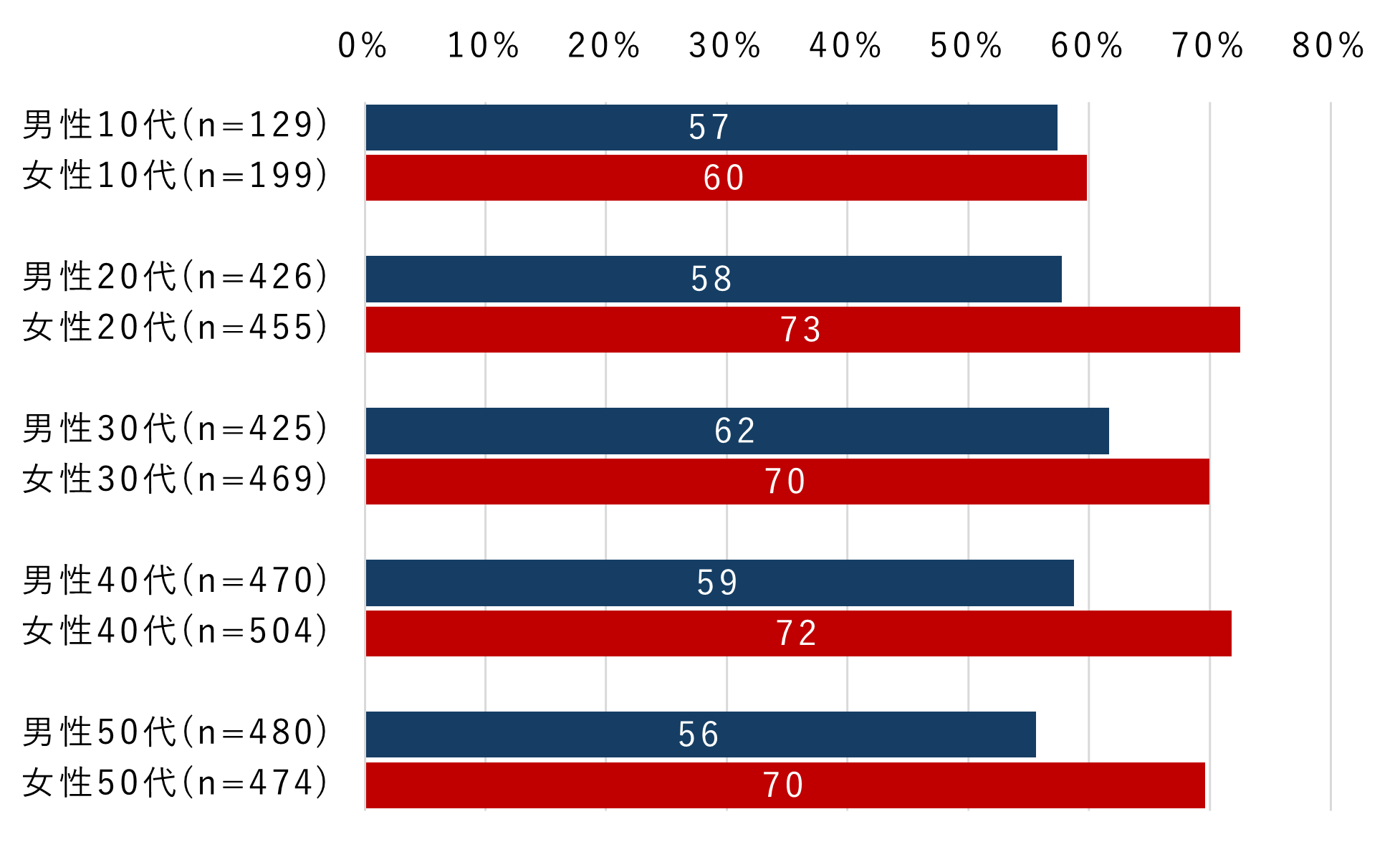 10代から50代のSNS利用者を対象に、「SNSには情報があふれていて、ついていくのに疲れる」と感じる割合を調査しました。性年代別に分析した結果、女性のほうが男性よりも情報疲労を抱きやすい傾向が確認されました。
