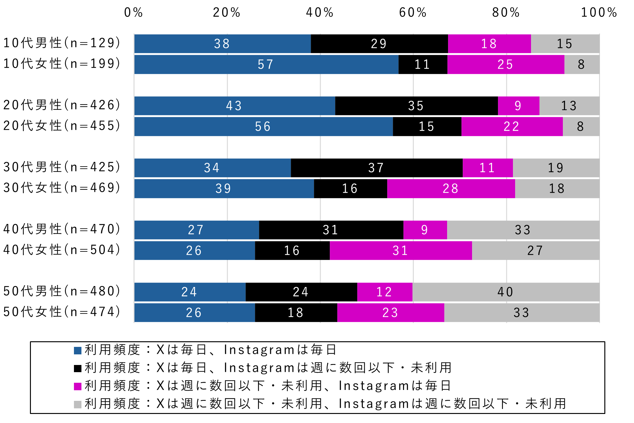 まず、SNSの中でも利用率が高いXとInstagramに着目し、XとInstagramそれぞれの利用頻度別の割合を調査しました。それぞれについて、毎日利用するか週に数回以下の利用かによってグループを分けて分析した結果、性年代によって利用傾向に違いがあることが明らかとなりました。特に10~20代女性では約6割がXとInstagramを毎日利用しており、他の年代と比べてSNSに触れる回数が多いことがわかりました。一方で、30代以降では、XとInstagramの両方を毎日利用する人は少なくなり、どちらか一方に偏る利用パターンが多く見られます。