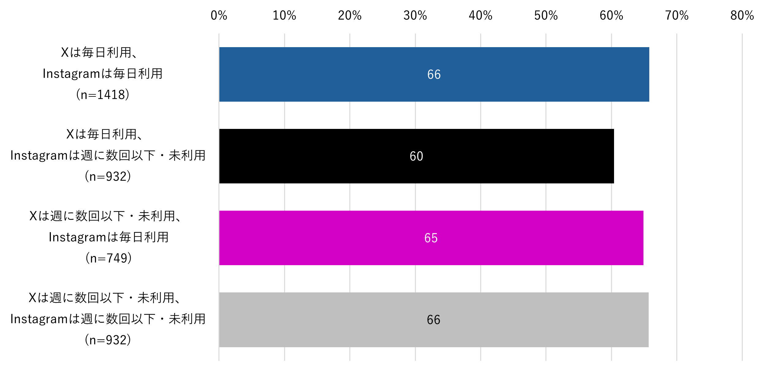 次に、SNS利用によって情報疲労を感じる割合を、XとInstagramの利用頻度別に比較しました。その結果、XにおいてもInstagramにおいても、利用頻度の違いによって大きな差は見られず、いずれの層でも一定の割合が、情報疲労を感じていることがわかりました。このことから、SNSの利用頻度にかかわらず、6~7割程度の利用者が、SNS利用における情報疲労を共通して感じていることが明らかとなりました。