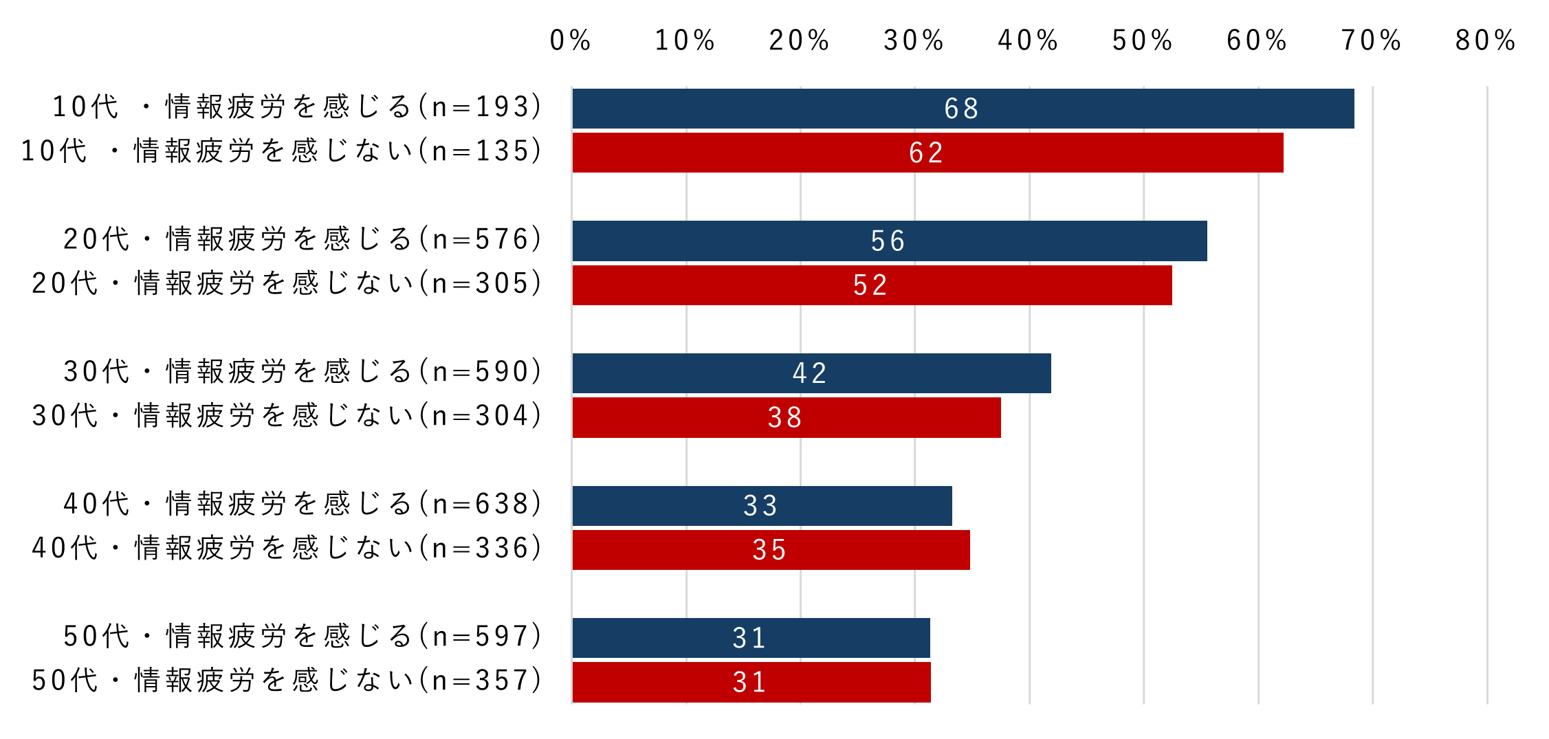 次に、10代から50代のSNS利用者を対象に、「SNSを利用すると幸福感が増す」と感じる割合を、SNSで情報疲労を感じているか否かの2つのグループに分けて比較しました。その結果、双方のグループで「SNSで幸福感が増す」と感じる回答が確認されました。10代から30代では、情報疲労を感じている層のほうが幸福感の向上を実感する傾向がみられました。40代と50代では情報疲労の有無による差は小さく、ほぼ同程度の結果となりました。