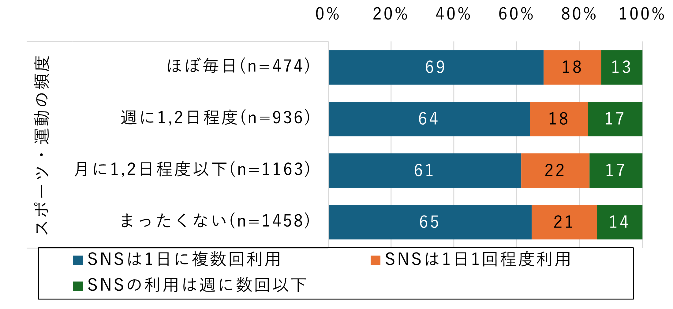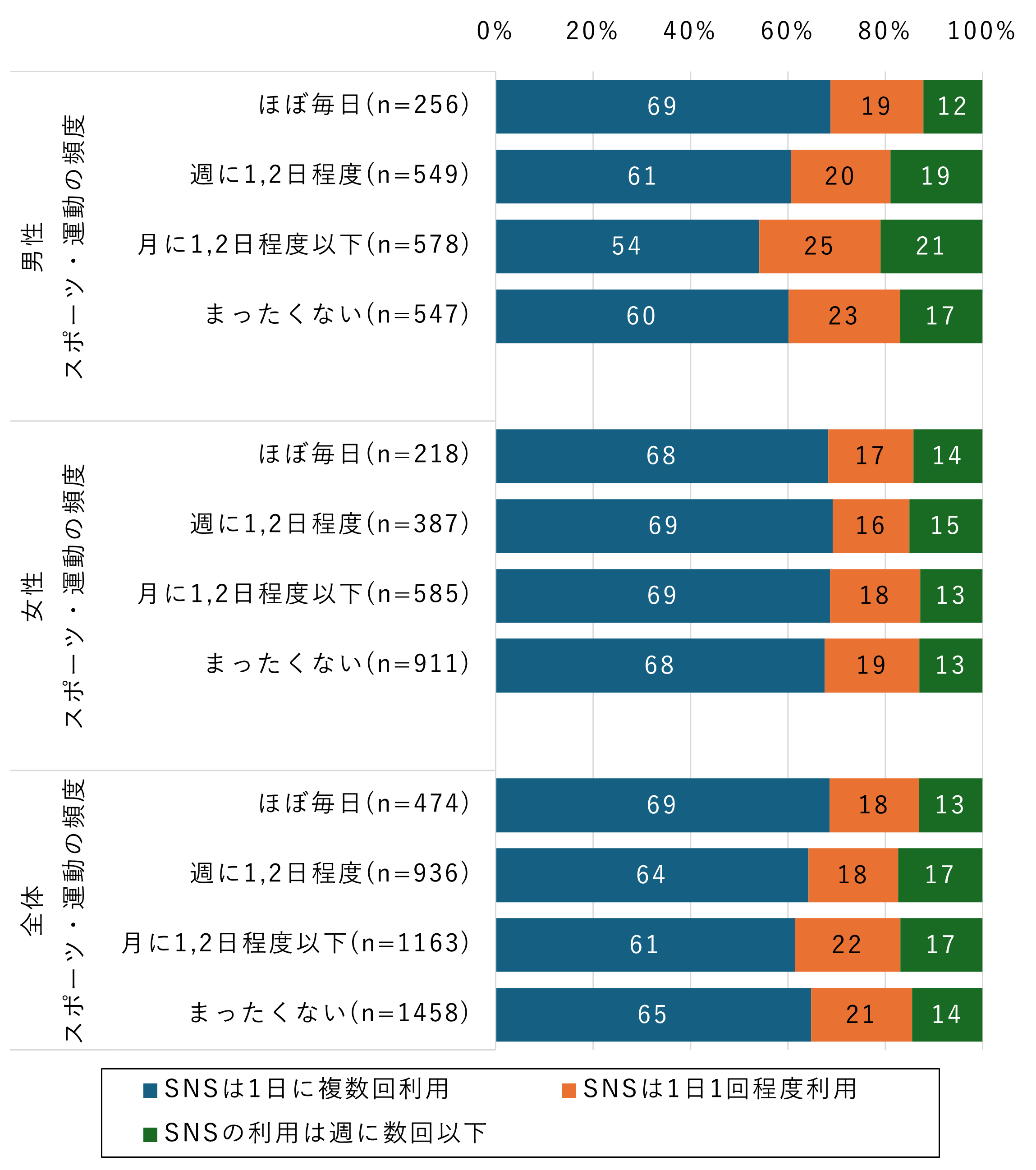 このことから、SNSの高頻度利用は、スポーツ・運動を日常的に行うかどうかと単純に対応しているわけではなく、身体的にアクティブな層と、そうでない層の双方にSNSを頻繁に利用する人が存在している状況がうかがえます。