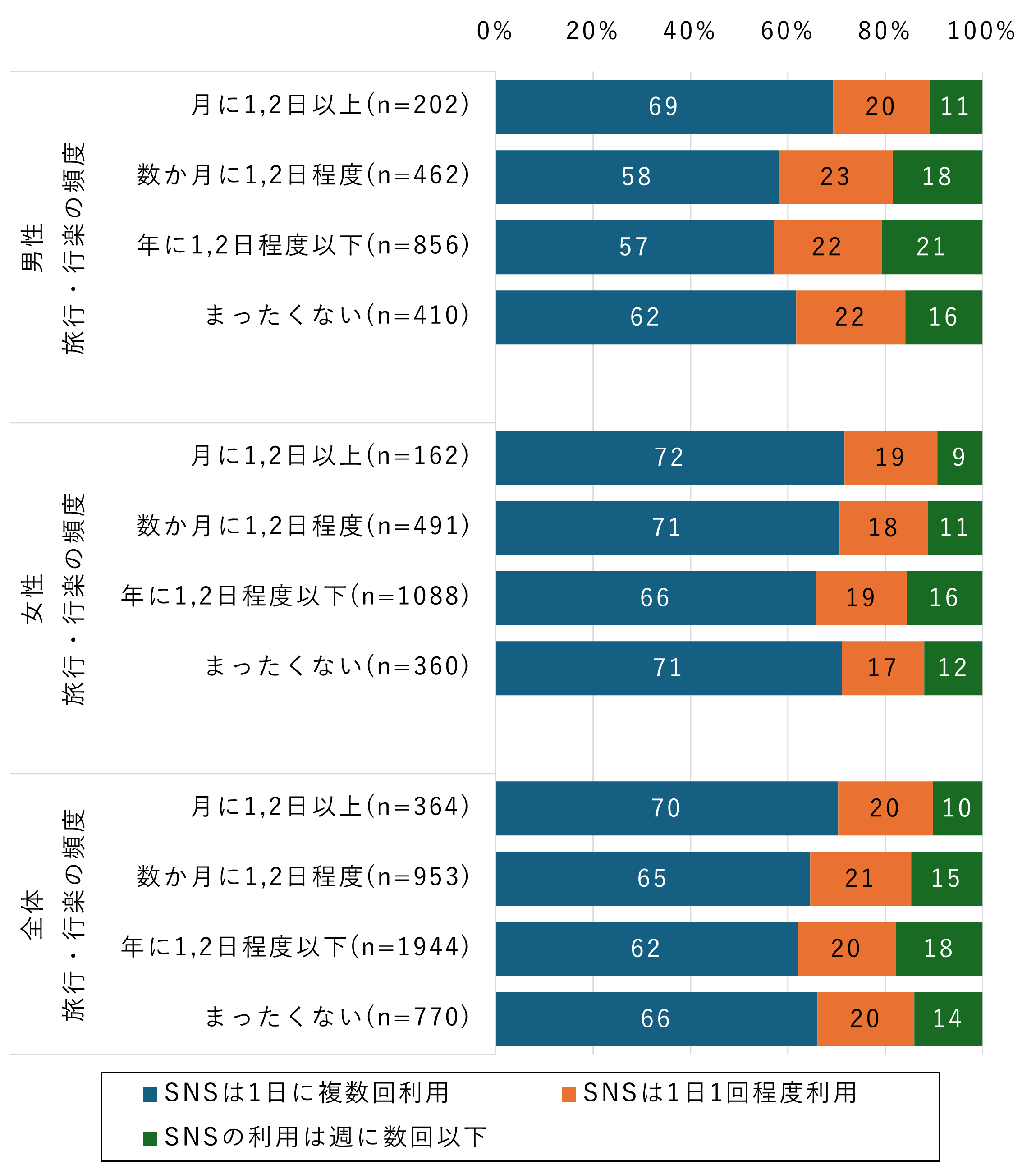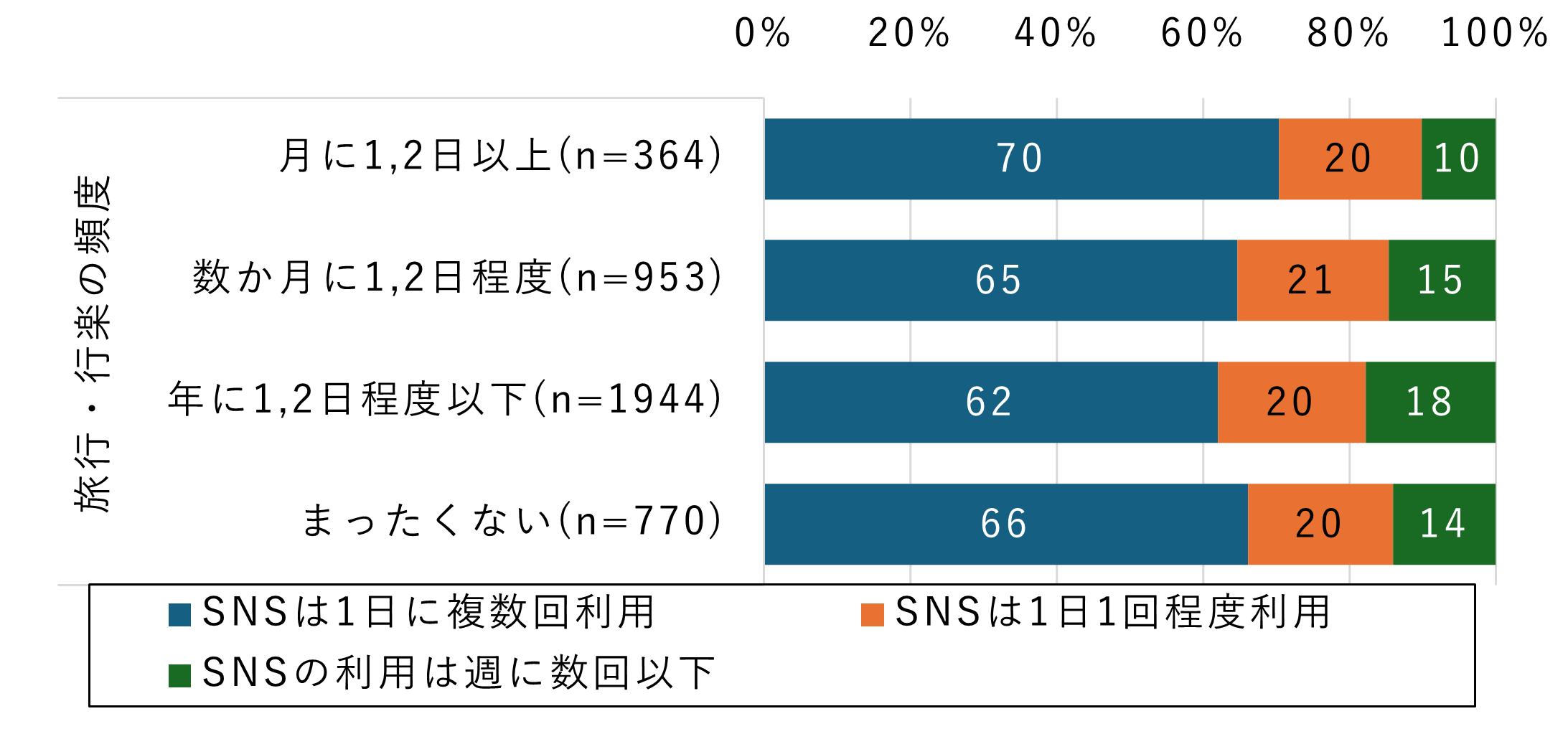 - 旅行・行楽でも同様に、「行かない層」と「高頻度層」でSNSの利用頻度が高い