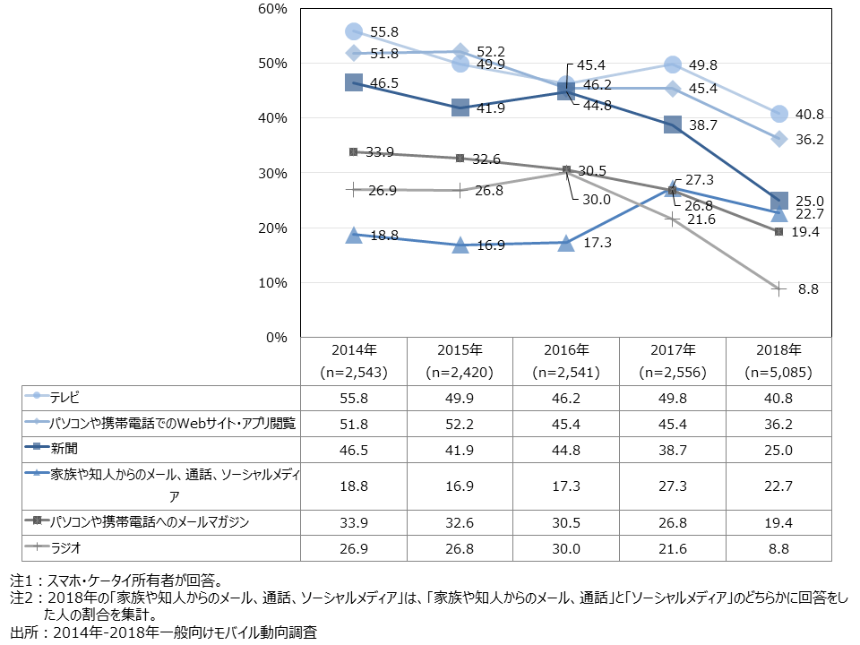 - 「テレビ」、「新聞」はやや減少傾向が見られるものの、依然として約半数が利用。