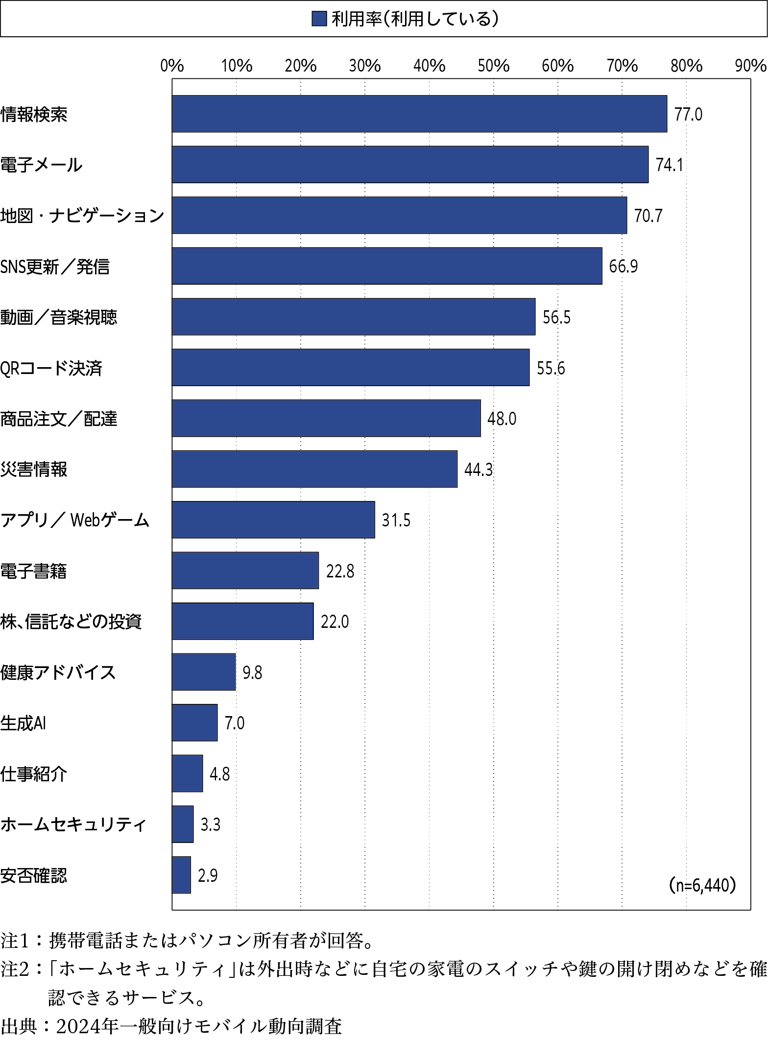 - 次いで、「電子メール」が74.1%、「地図・ナビゲーション」が70.7%。