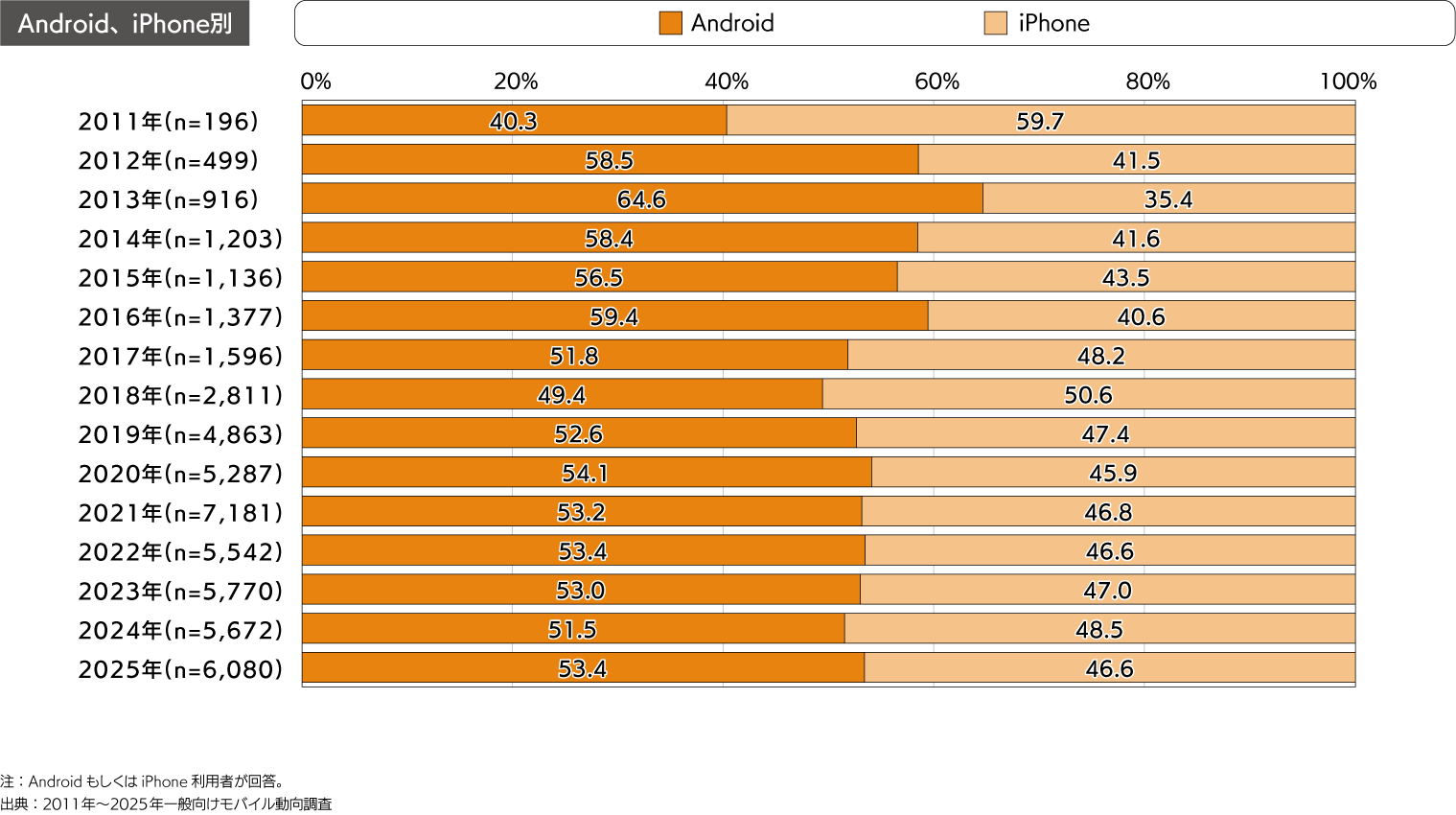 - Android・iPhone別では、2025年のAndroid比率は53.4%、iPhone比率は46.6%。
