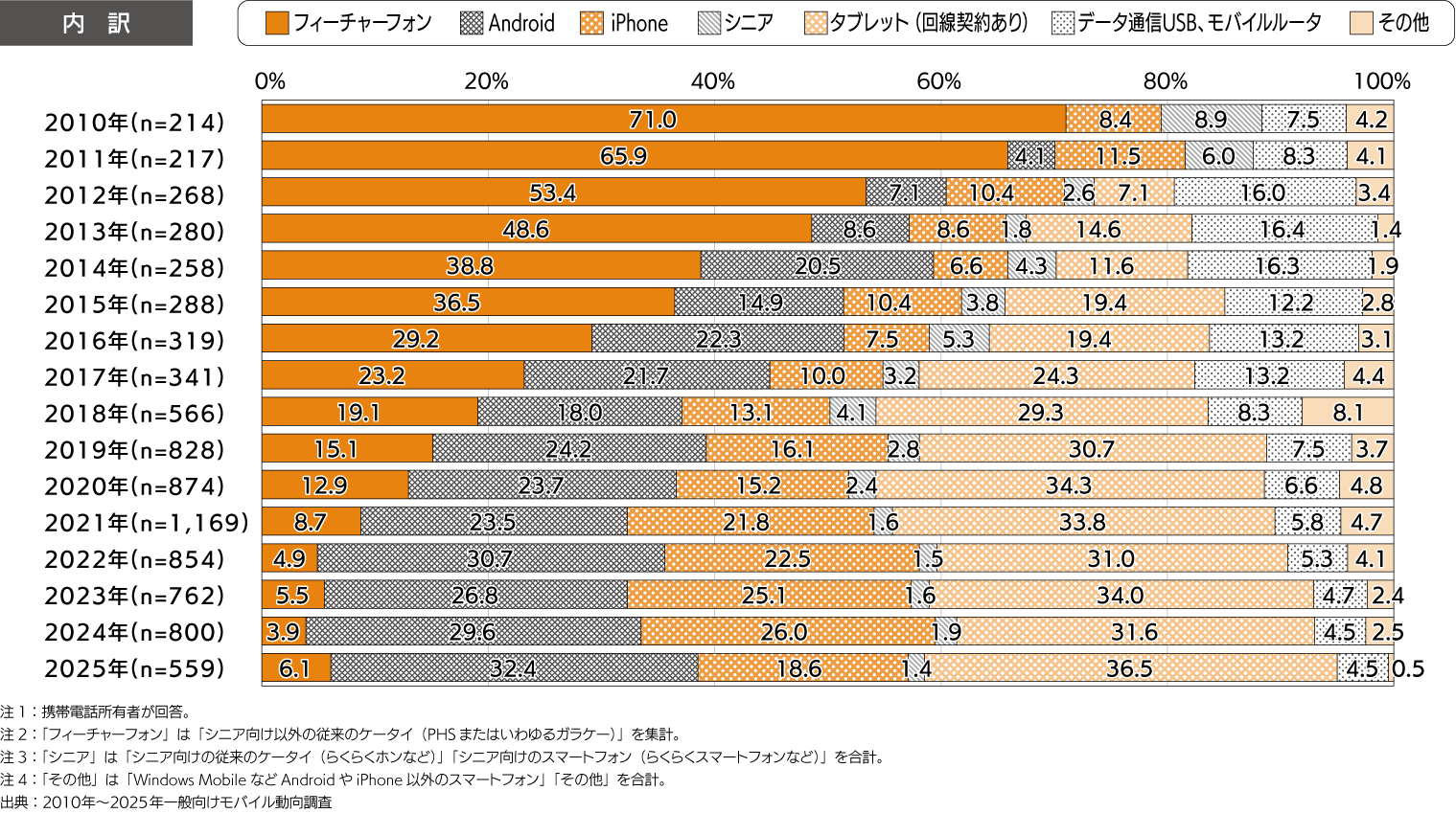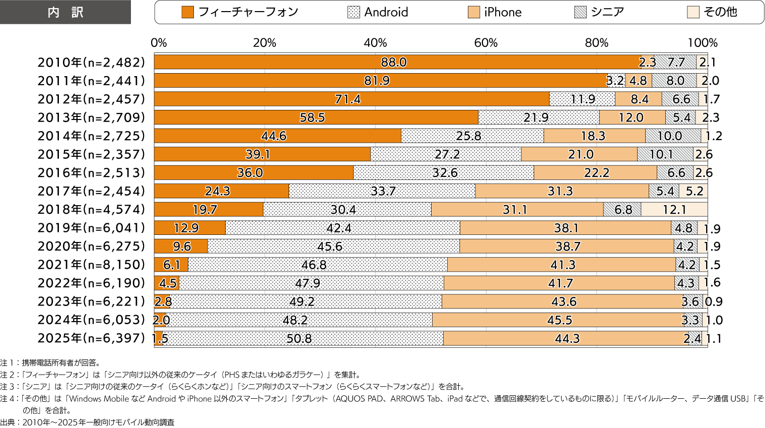 - 2025年のフィーチャーフォン比率は1.5%にまで減少。