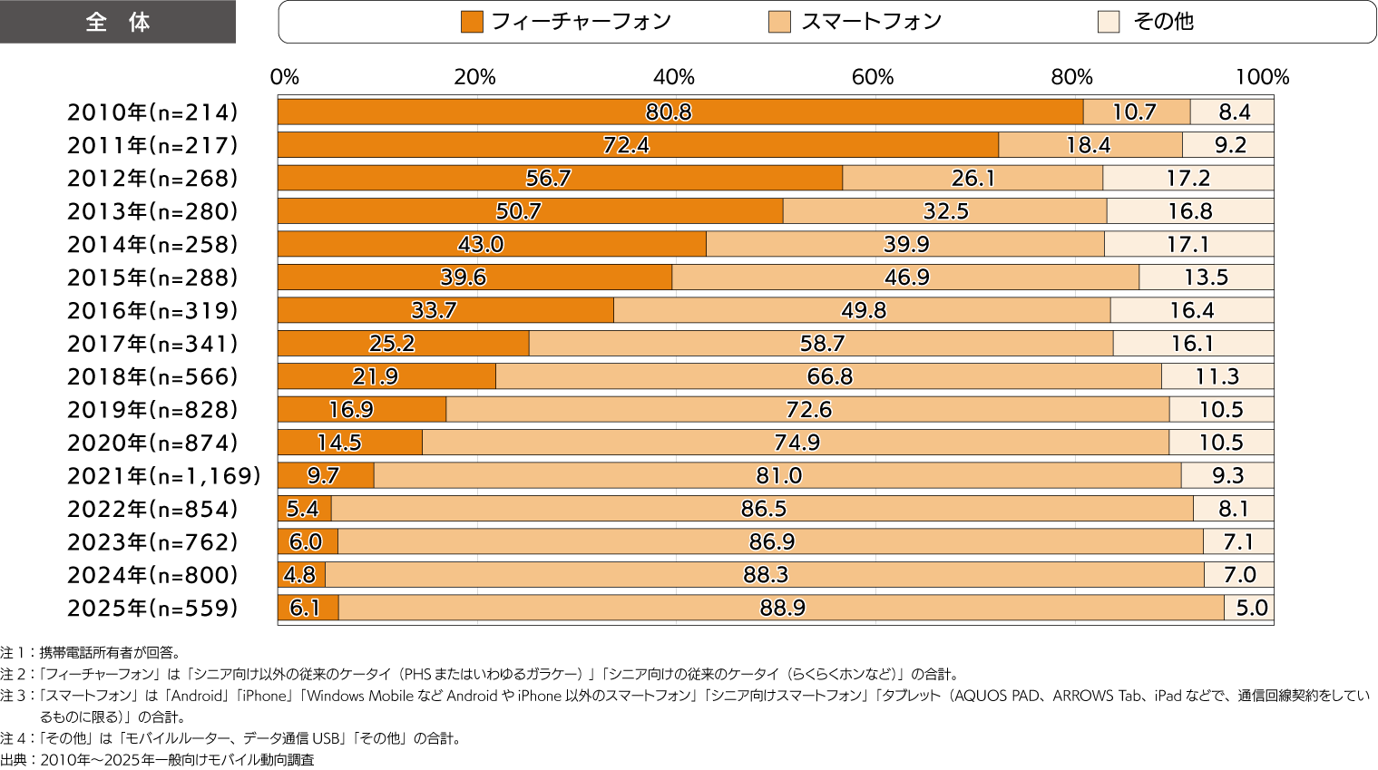 - 2025年のスマートフォン比率は88.9%。