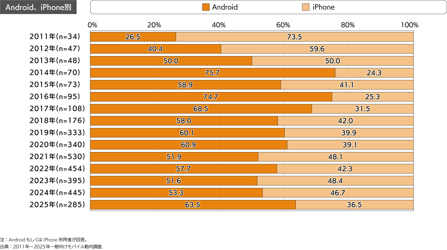 - Android・iPhone別では、2025年のAndroid比率は63.5%、iPhone比率は36.5%。