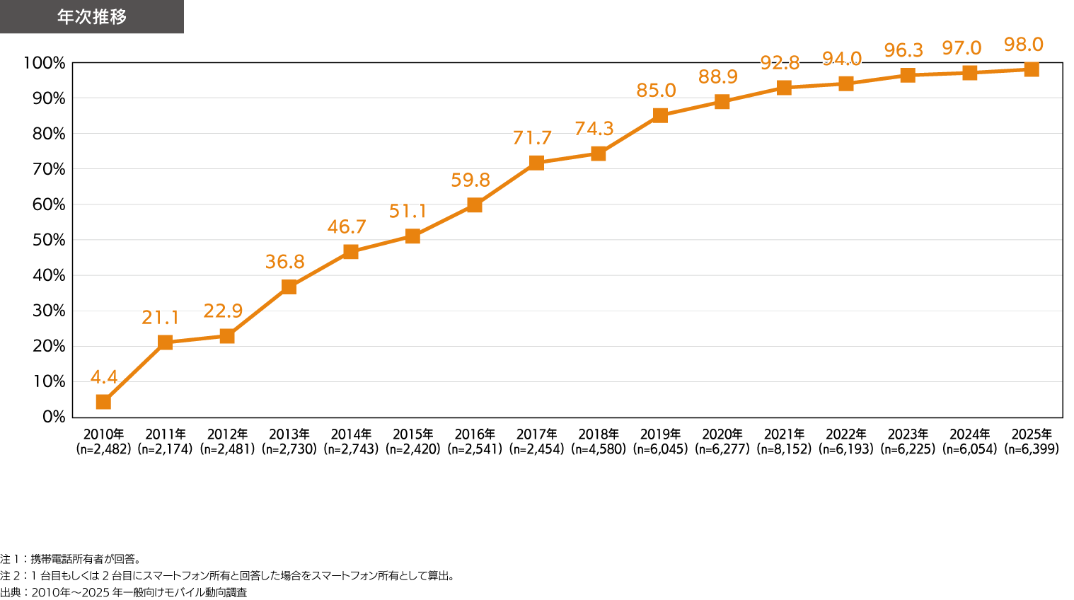 - 2025年のスマートフォン比率は98.0%。
