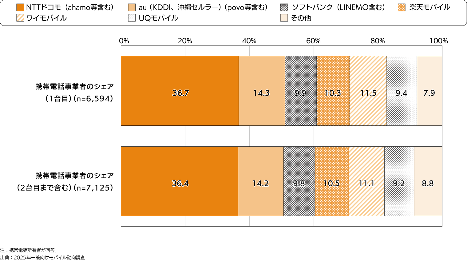 - 携帯電話事業者のシェア(1台目)は、「NTTドコモ」(36.7%)、「au(KDDI、沖縄セルラー)」(14.3%)、「ソフトバンク」(9.9%)の主要3社で6割程度となった。