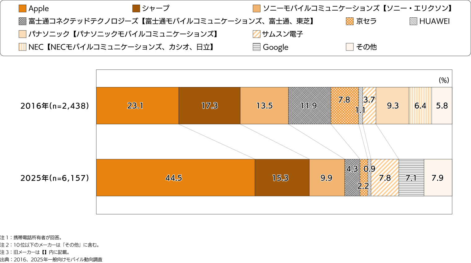 - 「Appleが最も高く、2016年の23.1%から2025年の44.5%と21.4pt増加している。