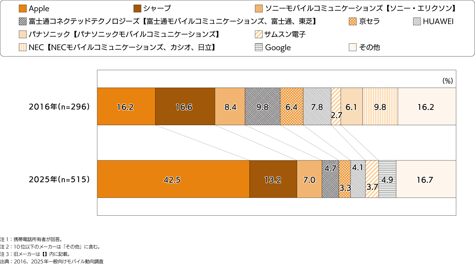 - 2016年は1位「シャープ」(16.6%)、2位「Apple」(16.2%)であったが、2025年は1位「Apple」(42.5%)、2 位「シャープ」(13.2%)となっている。