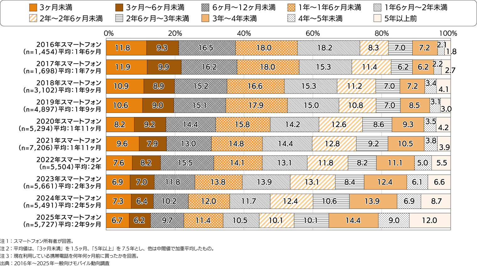 - 現在利用しているスマートフォンの所有期間の平均は、2016年の「1年6ヶ月」から2025年の「2年9ヶ月」に伸びている。